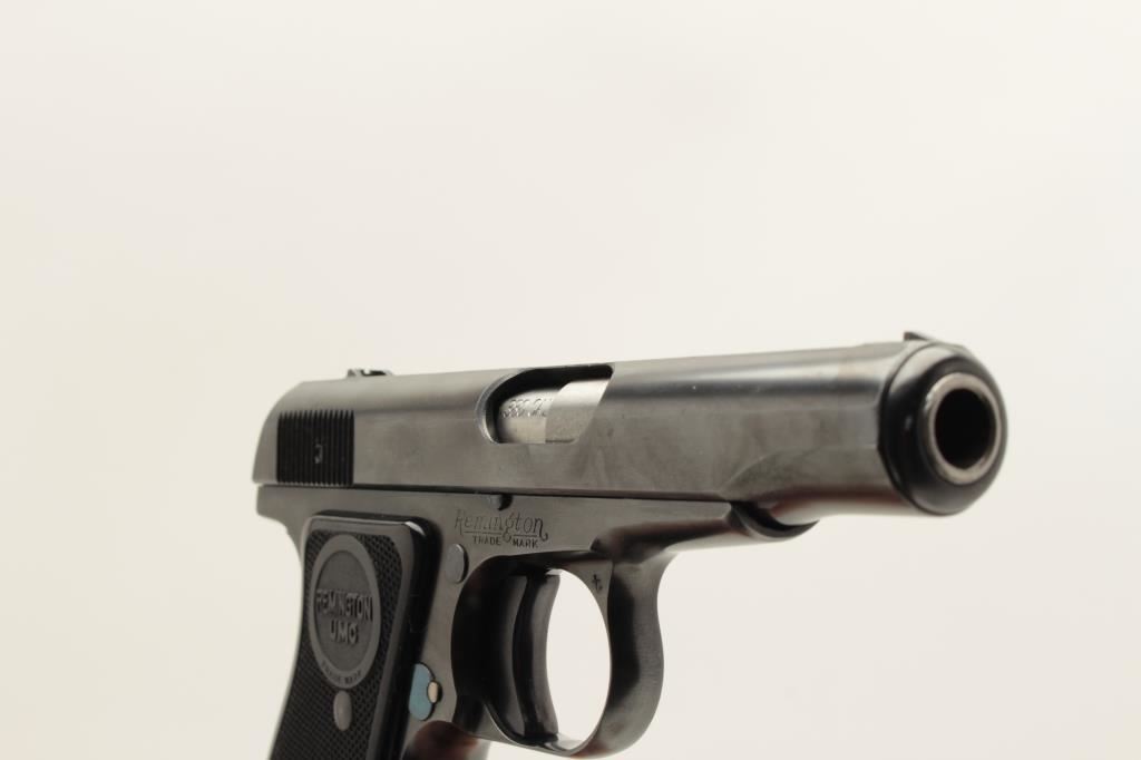Remington Model 51 semi-automatic pistol, .380 caliber, 3.25” barrel, blued finish, checkered black grips, S/N PA42055, in overall excellent condition showing minimal use or handling, fine bore, crisp action fine grips; accompanied by factory cardboard box displaying minor repair and with instructions sheet, cleaning brush and Gun Ownership Certificate issued to farmers Merchants Bank, Marinette, Wisc. (C&R). Est.: $2,500-$5,000.