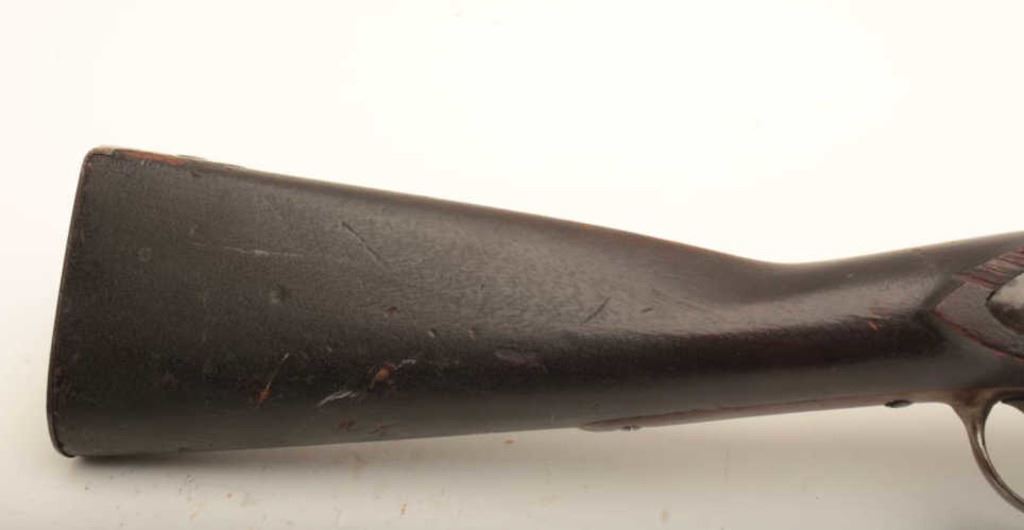 Harper’s Ferry percussion musket, approximately .69 caliber. The rifle is in good overall condition with a 42” round barrel. The barrel has gone to a light brown patina with “V”, “P” and eagle head proofs at the breech. The action is marked, “HARPER’S FERRY 1826”. The smooth wood stock shows heavy use with mars and compressions. There is a loss of wood at the lock plate, several proof marks at the left rear of the action and a smooth metal butt plate. The rifle features sling swivels, ram rod and barrel bands. Est.: $600-$1,200. (Antique).