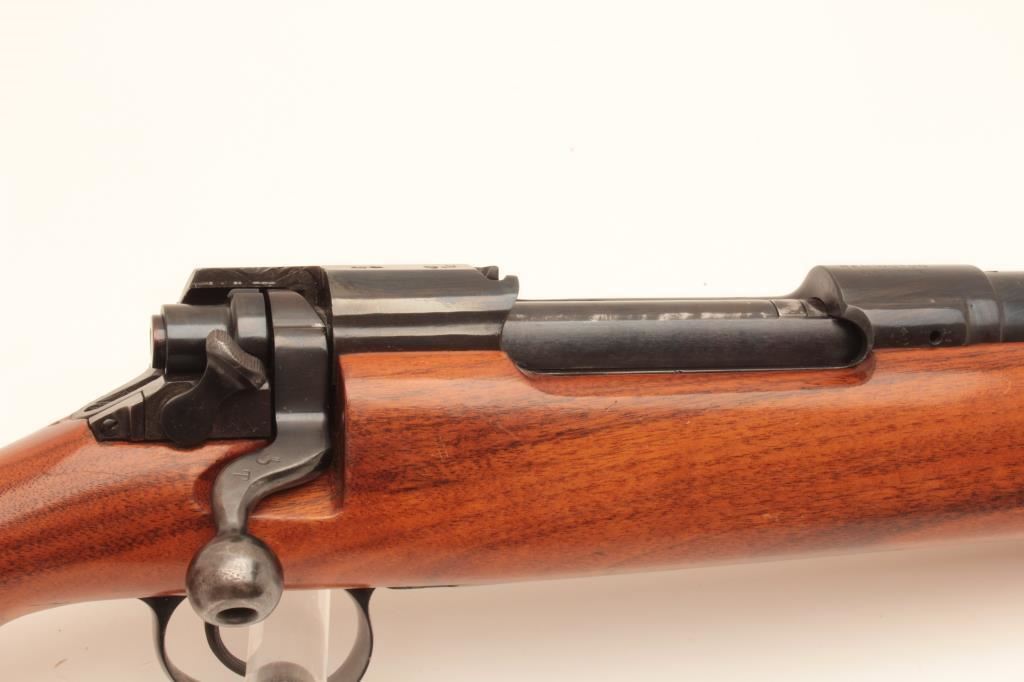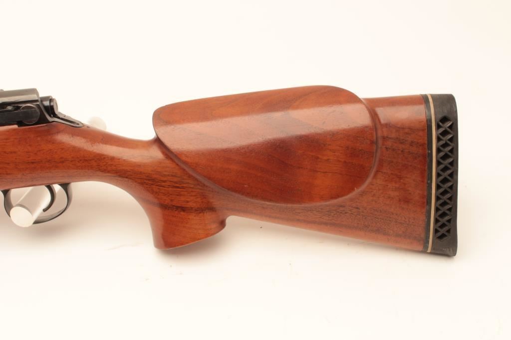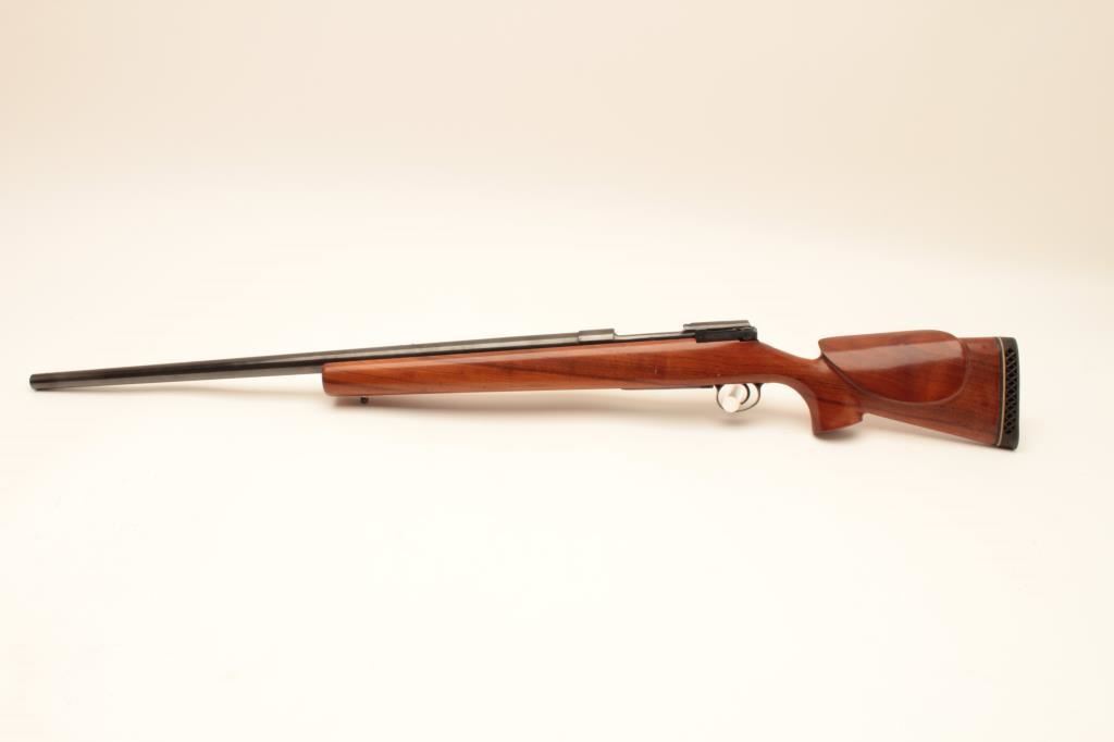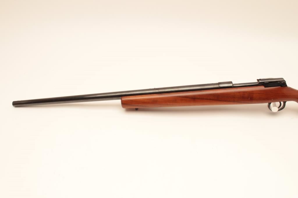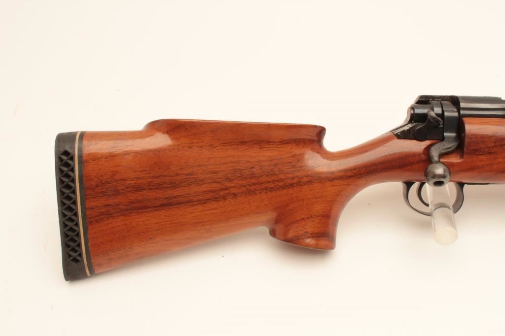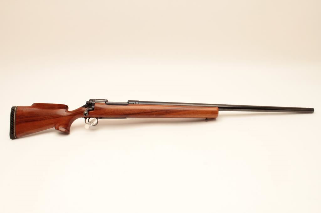 Custom Bench Rifle on 1917 Remington action with Heavy Bull BBL marked Ron Eklund in 308 Norma Mag Caliber 28” BBL measured and 47 ½ inch overall. Target style stock with Monte Carlo cheekpiece, BBL and action tapped for long target scope. Very good plus condition with minor use and firing. Bore fine, vintage styling probably 1950s-1960s.(2 boxes of ammo included) Est:$500-1000