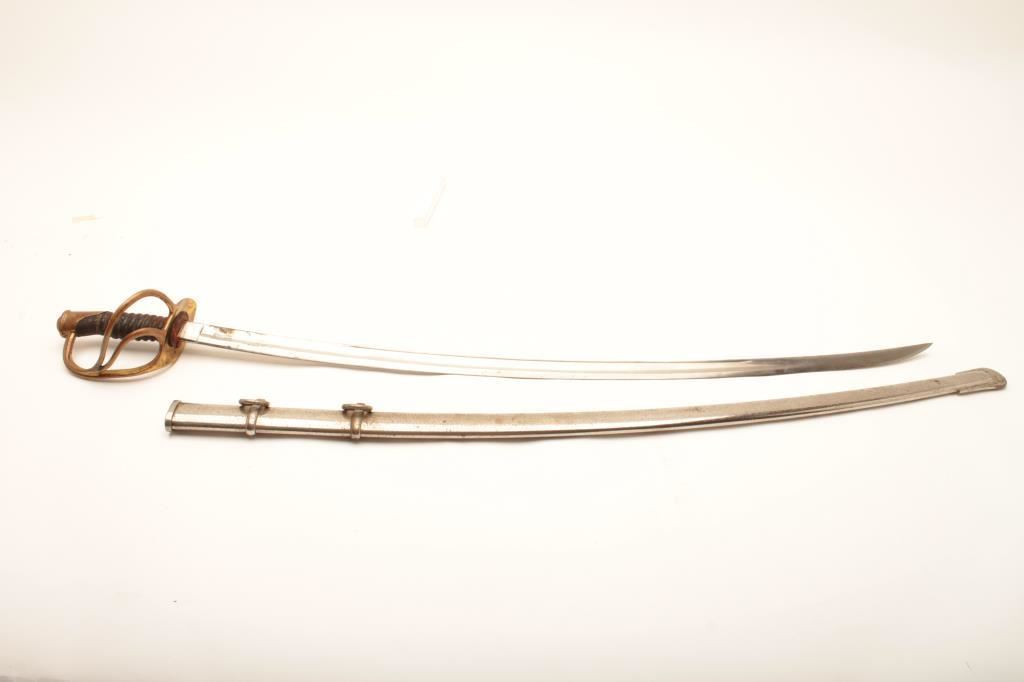 Model 1860 Cavalry Officer’s saber and metal scabbard base of blade on one side is stamped “25”, wood grip with most of wire wrap missing, brass guard; blade is overall good as is the scabbard that displays most of its nickel finish with scattered spots of erosion. Est.: $200-$400.