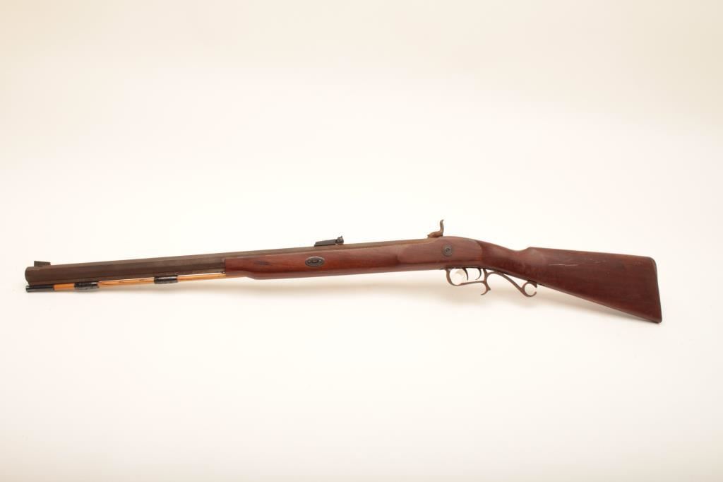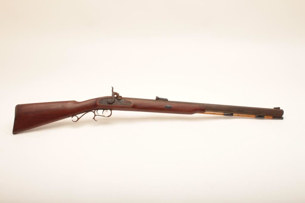 Thompson Center Arms Renegade Model copy of a half stock percussion plains rifle, .50 caliber, 27” octagon barrel, blue and case hardened finish, wood stock in overall un-cleaned fair to good condition showing scattered surface rust spots and areas from poor storage, good action, markings and wood; bore should clean to good; a little TLC on this gun should greatly improve its appearance. Est.: $300-$500.