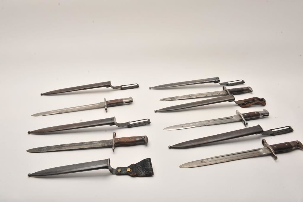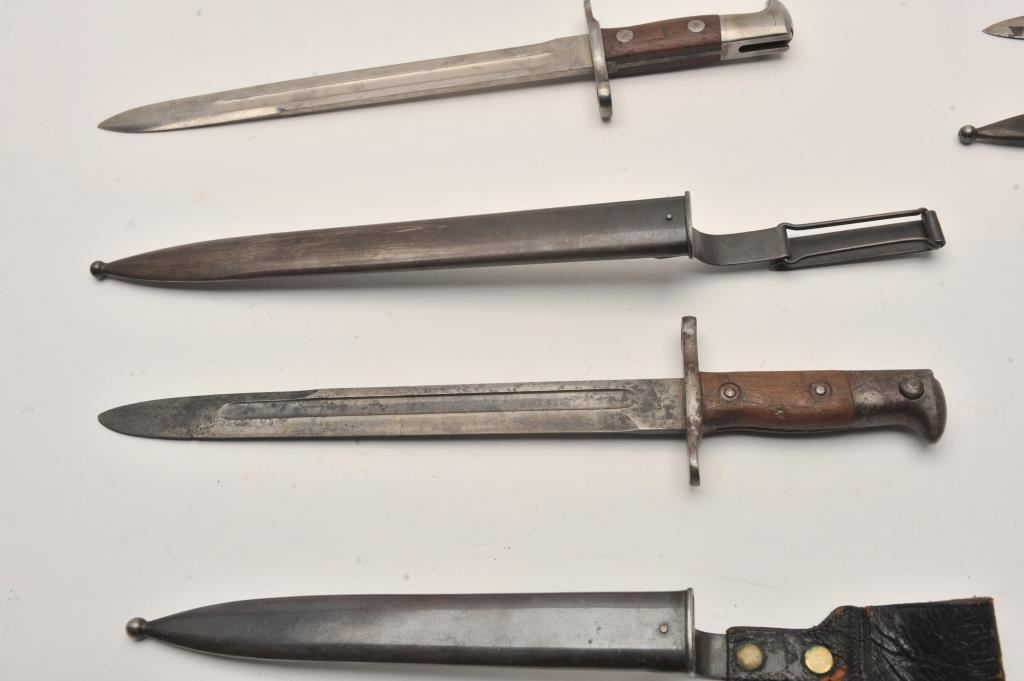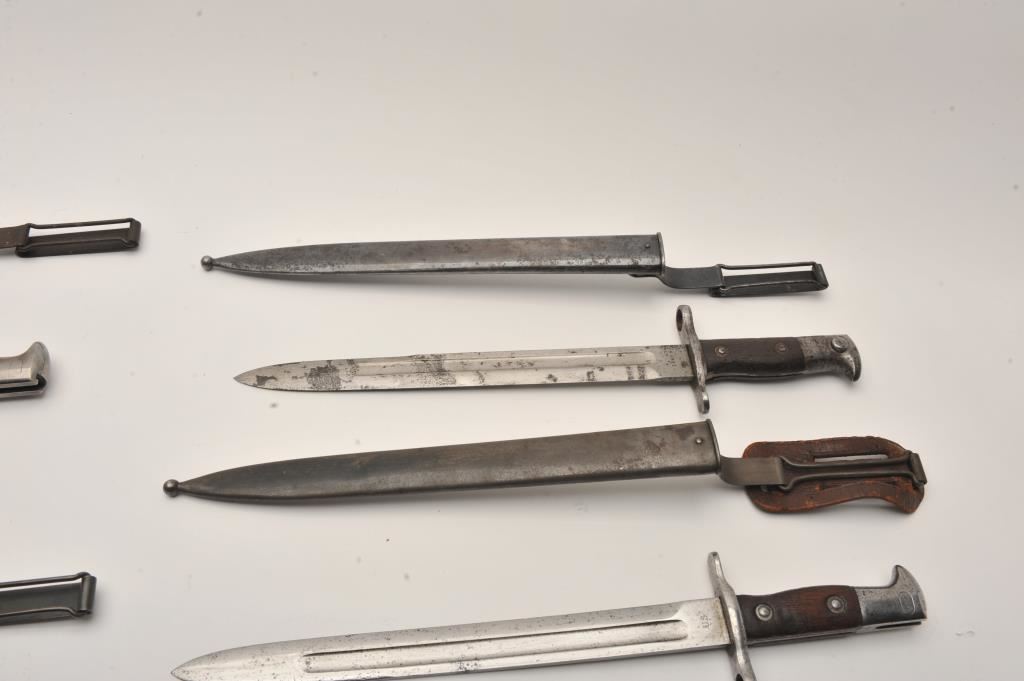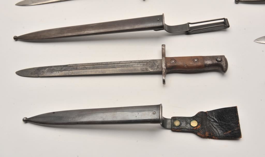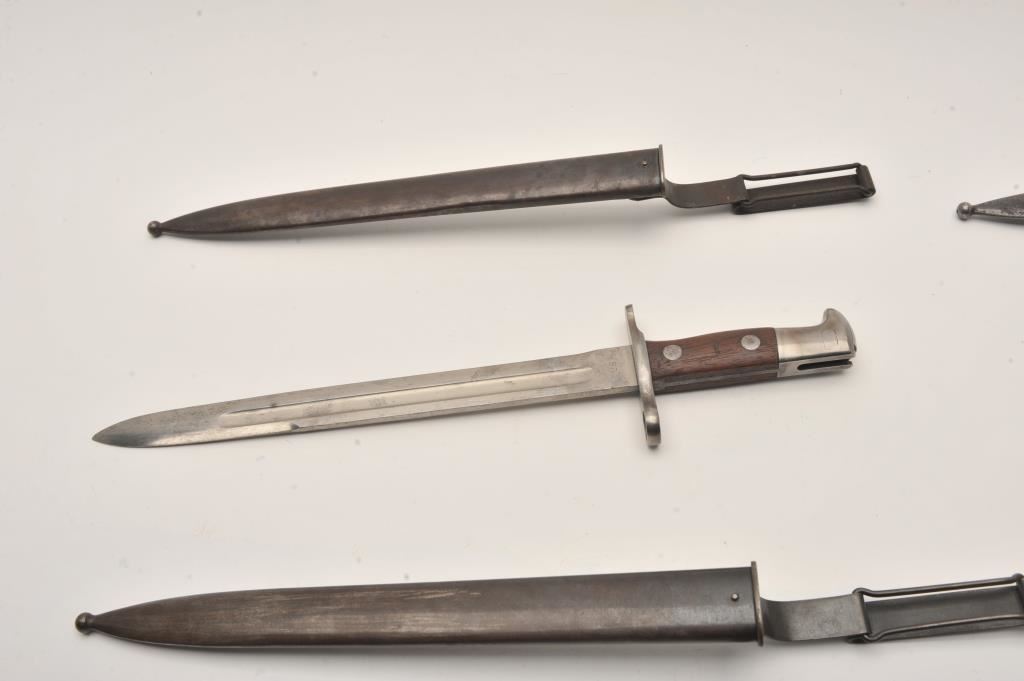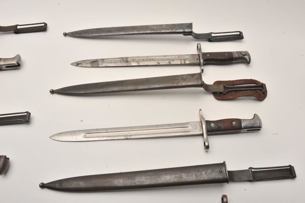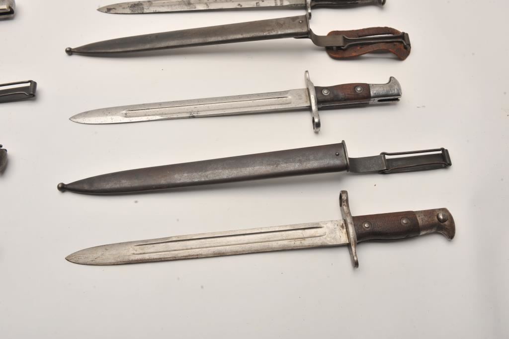 Lot of 5 Krag bayonets and scabbards, all good or better, dated 1894, 1895, 1896, 1899, and 1901. Est. $200-400