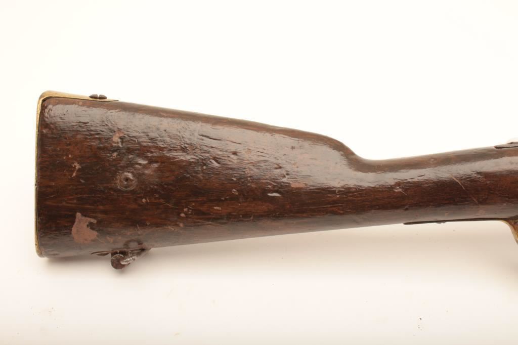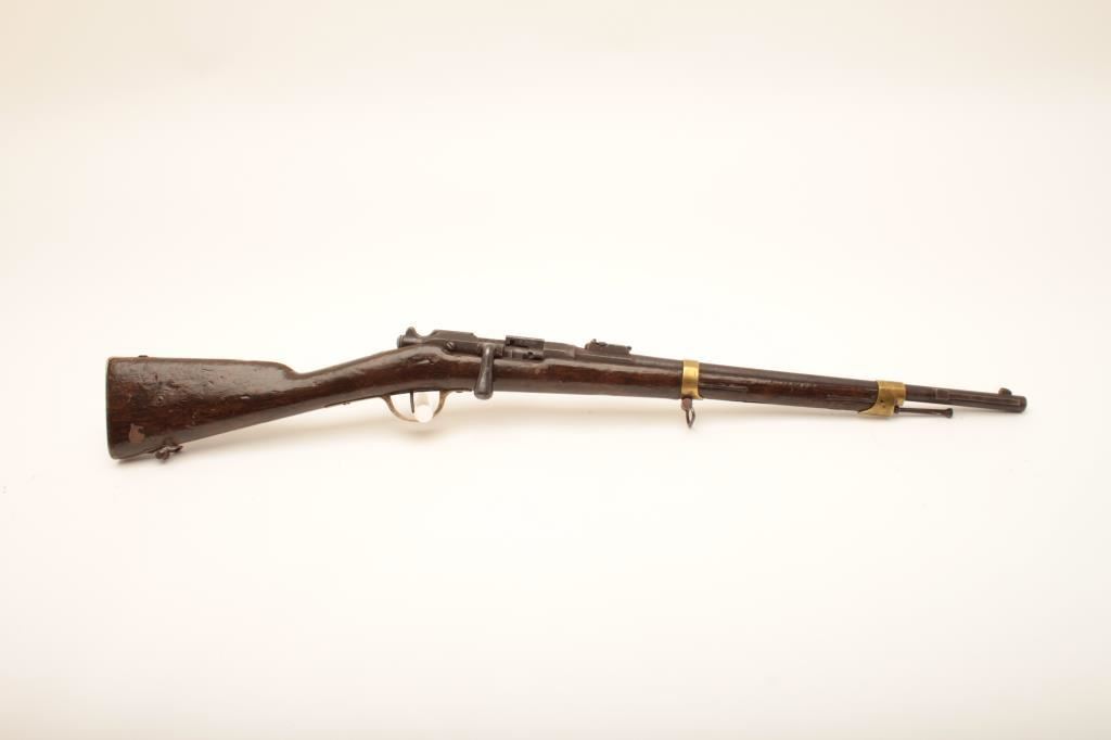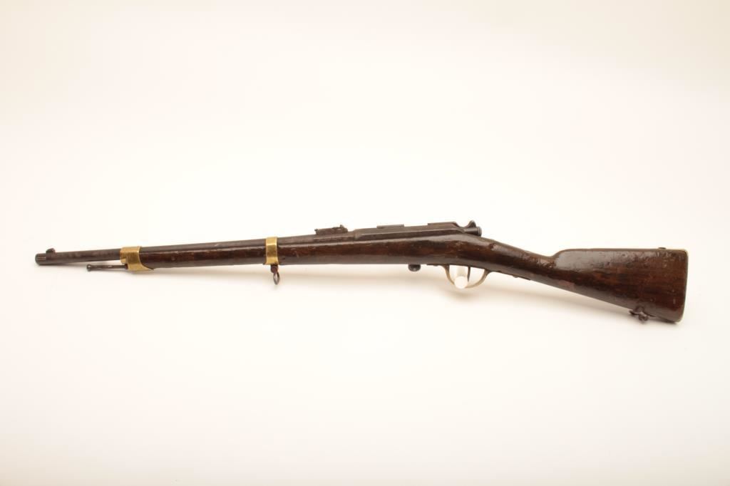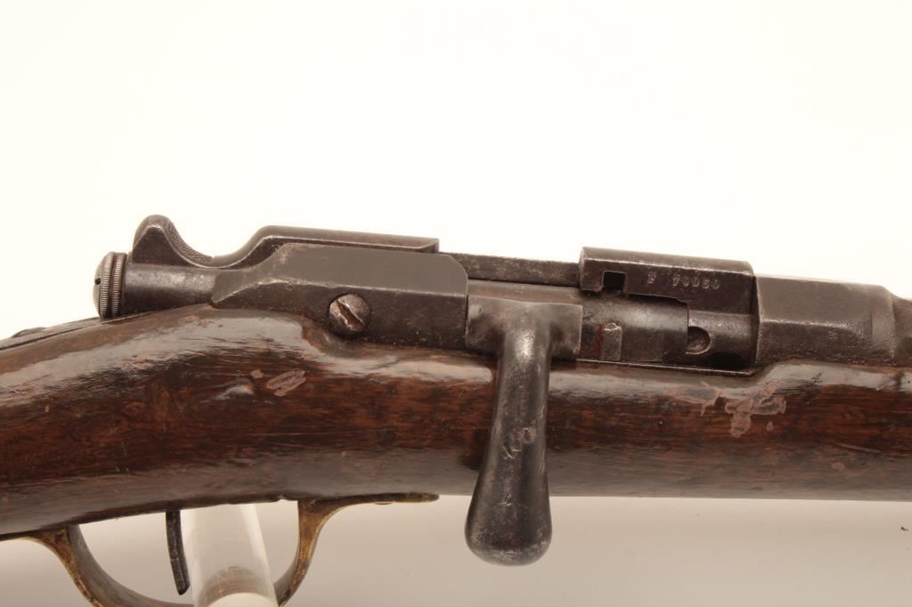 Mauser Model 1871 bolt action carbine, 11mm cal., 20” barrel with bayonet lug, brass bands, trigger guard and butt plate, wood stock in well-worn condition, dark patina on metal surfaces, dark bore, good action, wood has been heavily re-finished. (Antique). Est.: $250-$500.