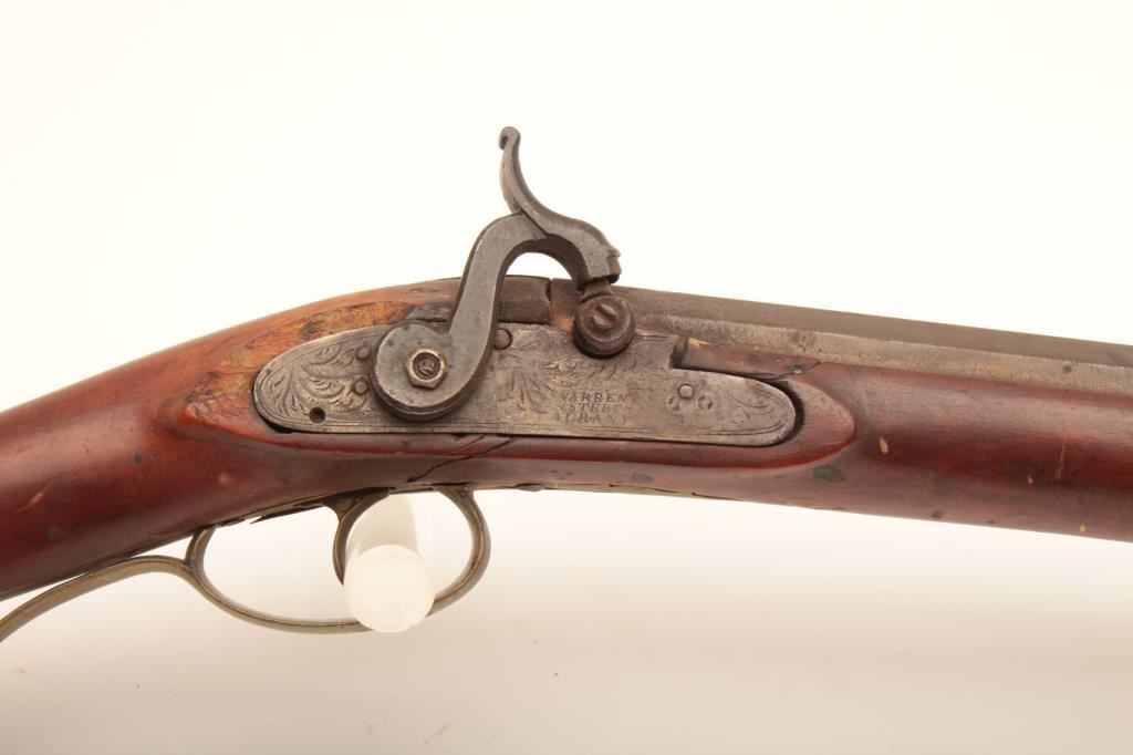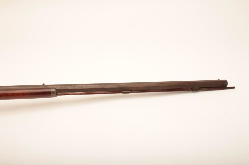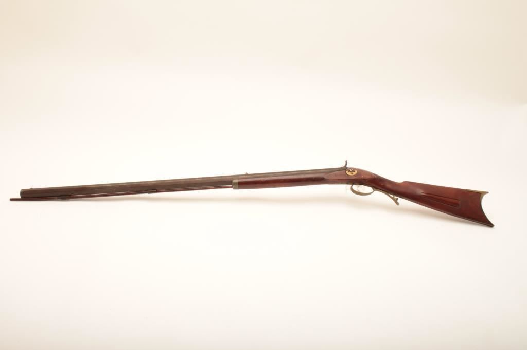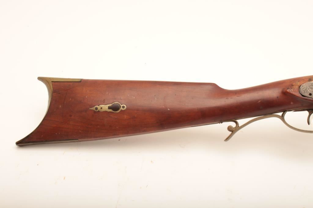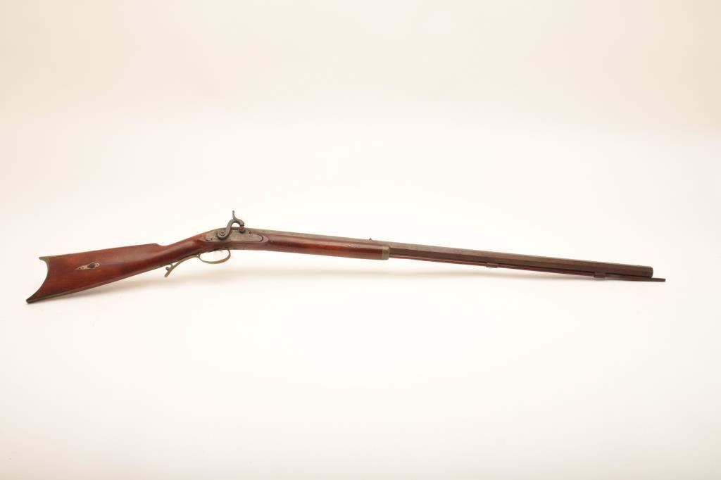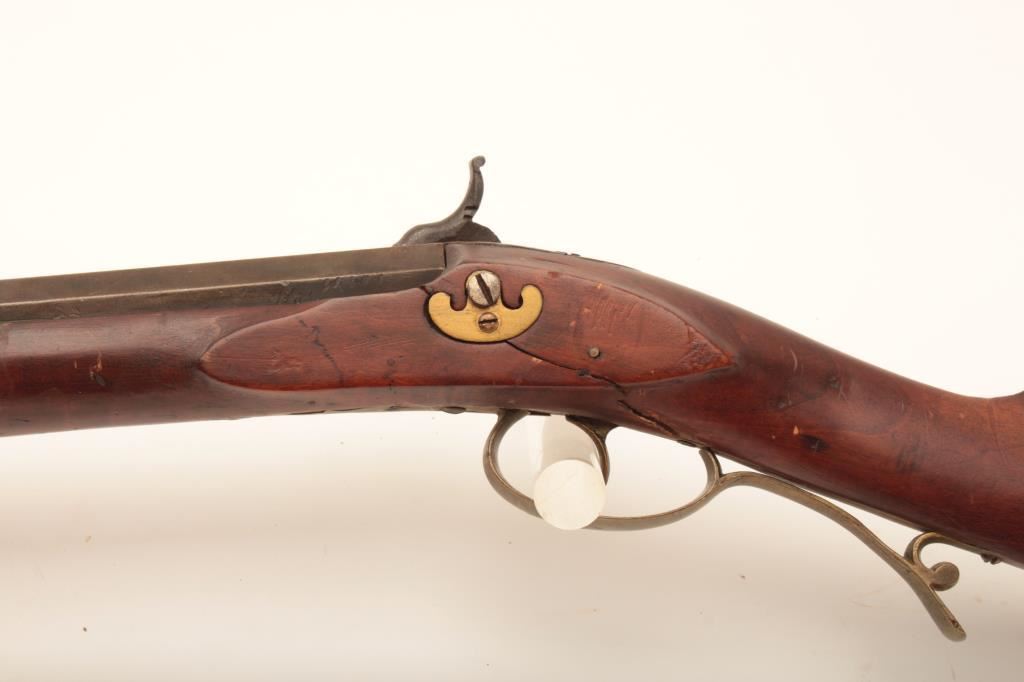 Half stock percussion plains rifle, .38 cal., 34” octagon barrel, single trigger, wood stock, brass trigger guard, butt plate and small patchbox. This gun is in overall good condition showing a brown patina, good action, dark bore; good wood stock with an old loss at the top rear of the lockplate and several repaired cracks to the wood around the lock mechanism. Est.: $200-$400.