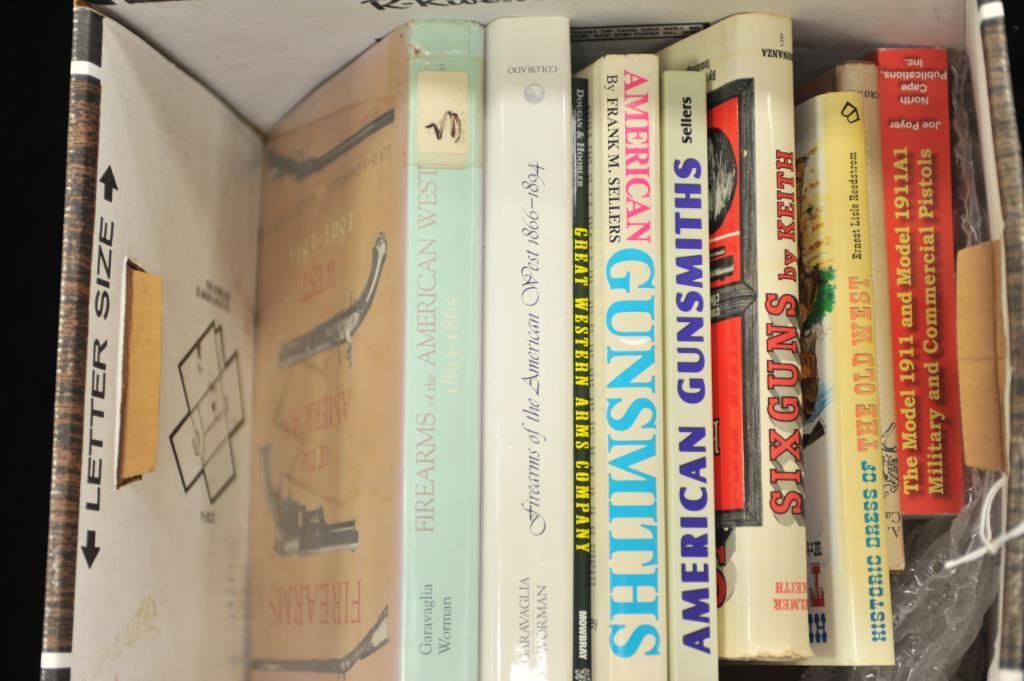 Lot of 10 books on collector guns and the West including both volumes of Garavaglia and Worman’s Firearms of the American West; American Gunsmith’s by Frank Sellers; Sixguns by Keith; The Model 1911 and Model 1911-A1 Military and Commercial Pistols by Poyer and Riesch and more. Est.: $100-$175.