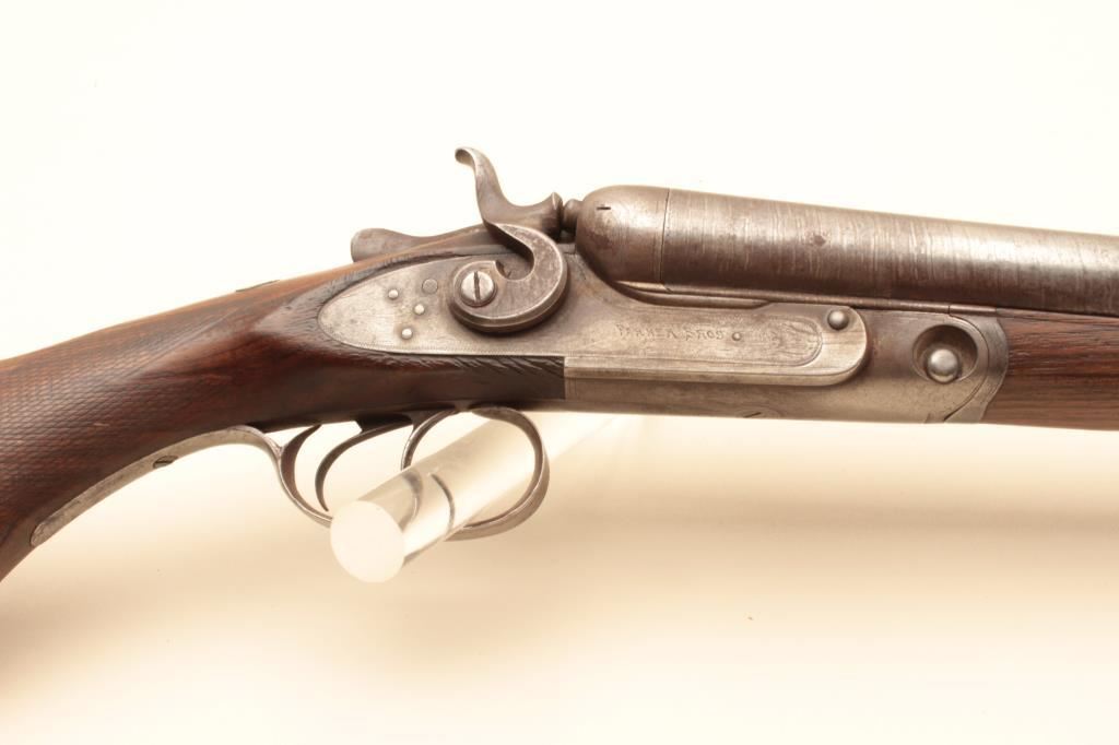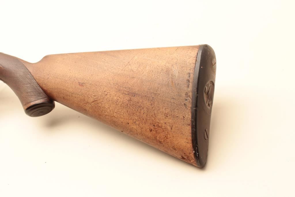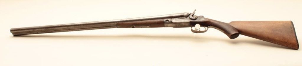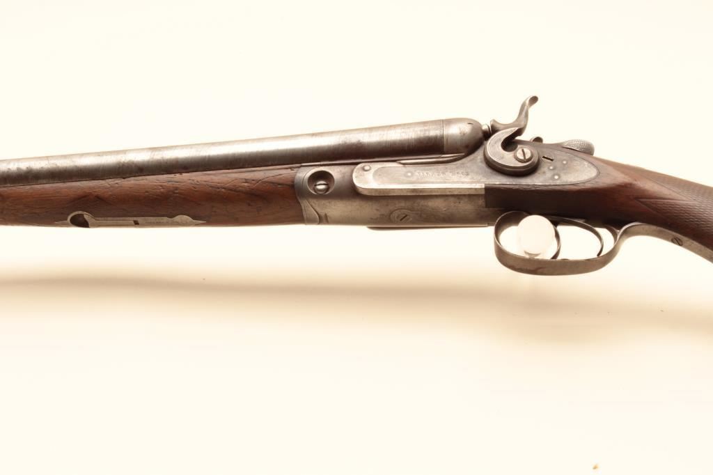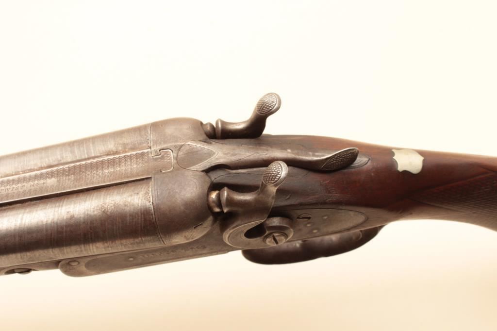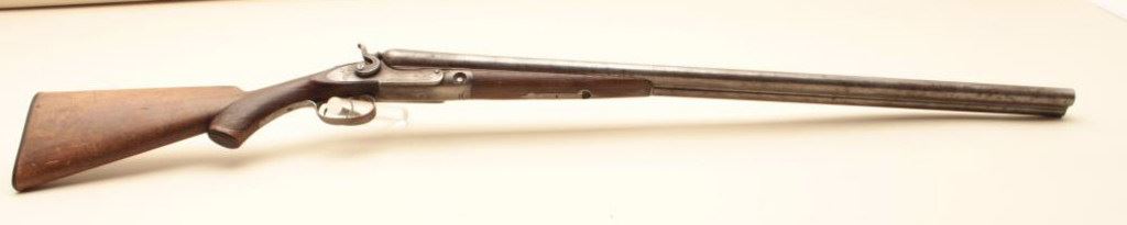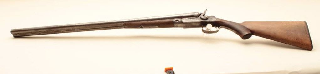 Parker S x S hammer shotgun, 12 gauge, Serial #NSNV. The shotgun is in fair overall condition with 30” Damascus barrels with a full-length filed rib and steel bead front sight. The metal surfaces have gone to a silver patina with some old toned case hardening still evident in the action side plates. There is a blank silver escutcheon plate behind the tang and a splinter fore end. The checkered wood stocks are in fair condition showing heavy use with mars and flattening of the checkering. The butt stock ends with a Parker Brothers marked hard rubber butt plate providing a 14” LOP to the front trigger. The bores are fair, the action functions and the markings are sharp. (Antique). $300-$600.