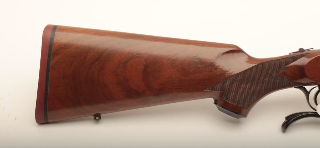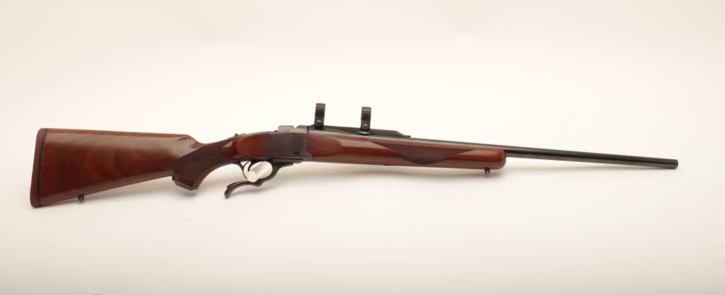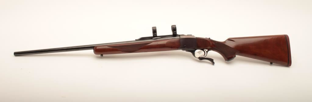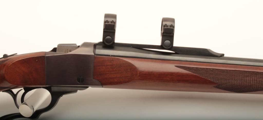 Ruger No. 1 single shot rifle, .243 Winchester caliber, serial #132-91920. The rifle is in very good to nearly fine condition with a 24” barrel. The barrel retains nearly all of its blued finish withonly light handling marks noted. The receiver features the older, desirable tang mounted safety and retains the majority of its blued finish. The checkered wood stocks are in very good condition with small marsand compressions consistent with use. The butt stock ends with a red, rubber Ruger marked recoil pad. The bore is very good, the action crisp and markings are sharp. The rifle is topped with set of Ruger rings. Aclean looking No. 1 with the older safety configuration. Est.: $500-$800. (Modern).