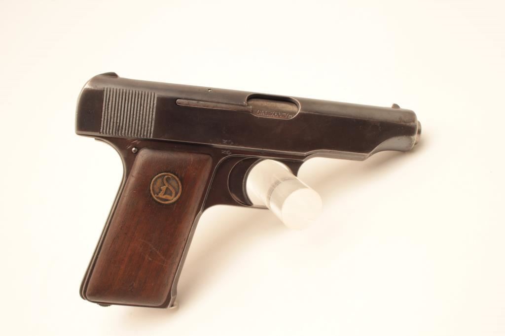 DWM Ortgies Model semi-automatic pistol, 7.65mm caliber, 3.5” barrel, blued finish, smooth wood medallion grips, S/N 61512; overall good condition with majority of muted blued finish remaining; some scattered spots of erosion, good bore, action, markings and grips that show some scratching to right side grip; accompanied by a brown leather flap holster and tie down strap. (C&R/PPT). Est.: $200-$400.