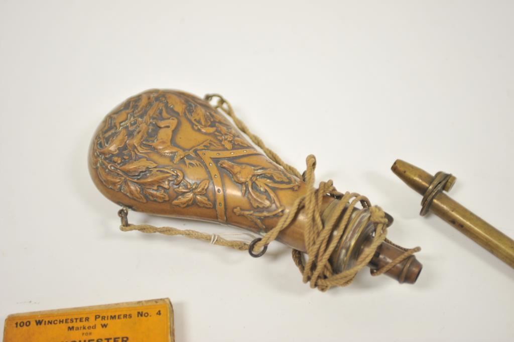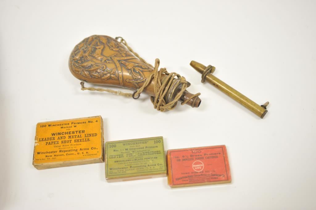Good AM Cap and Flask marked shotgun flask, brass powder measure and dipper, and 3 full boxes of primers. Est 200-400