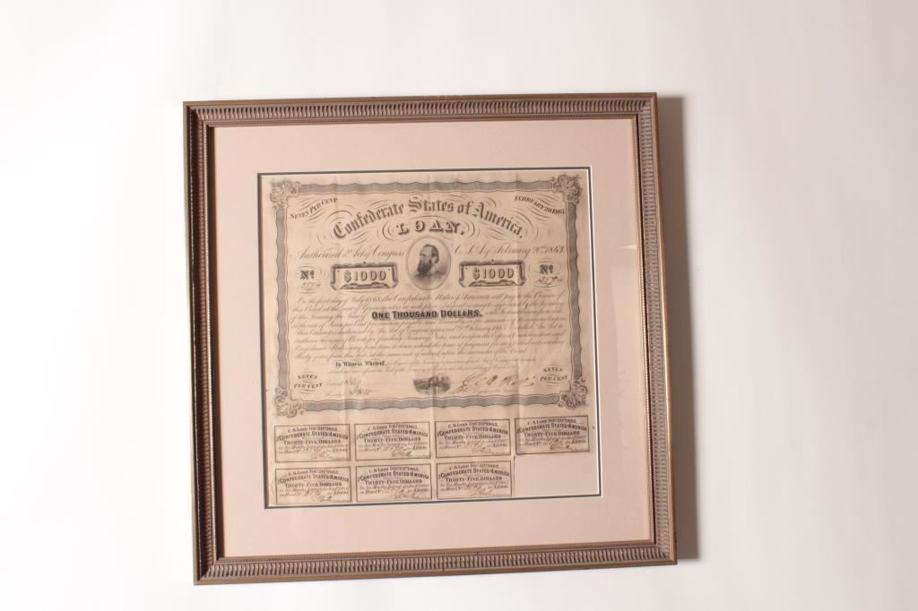 Confederate states of America $1000 war bond with portrait of General Stone Wall Jackson at center. No. 13594. C.S.A. issued 1863 at 7 % interest fully signed by Registry of Treasury with 7 coupons also signed. 1 coupon clipped (Cashed?). Very good condition with just normal paper aging. Authentic. Measures 13 ½” x 13 ½”. Est.: $300-$600