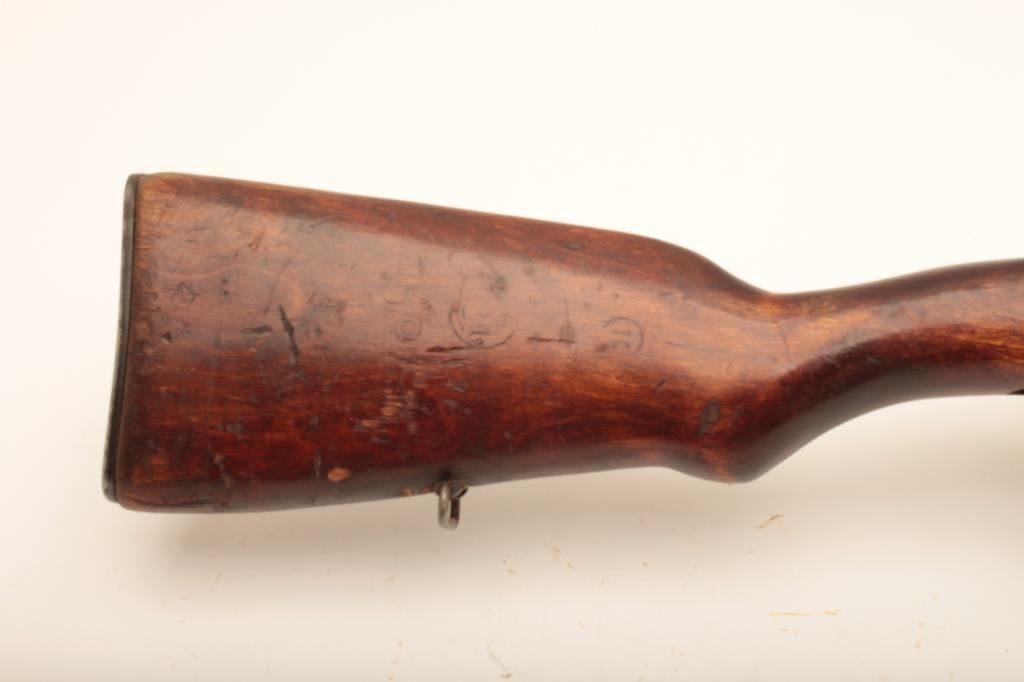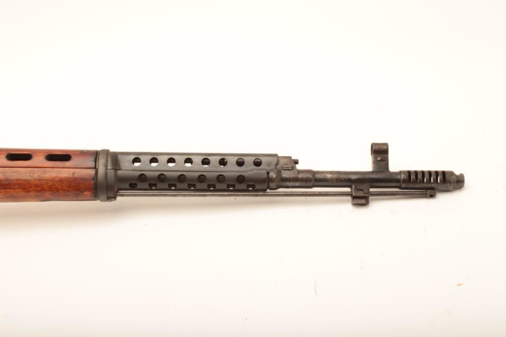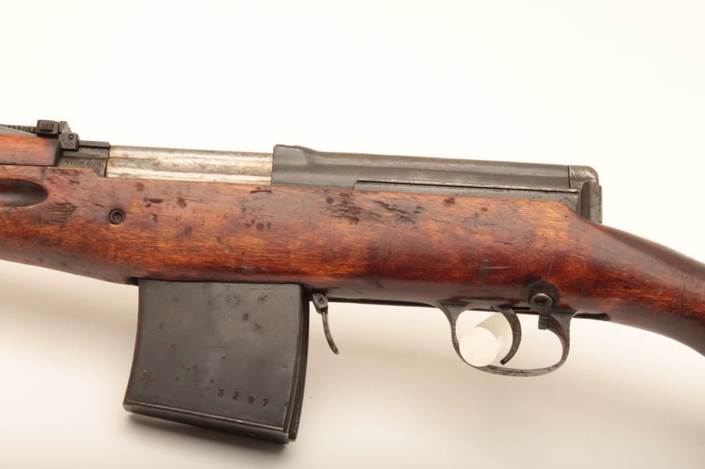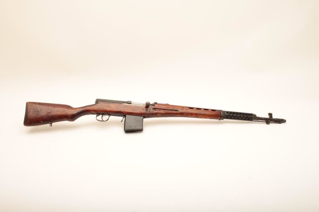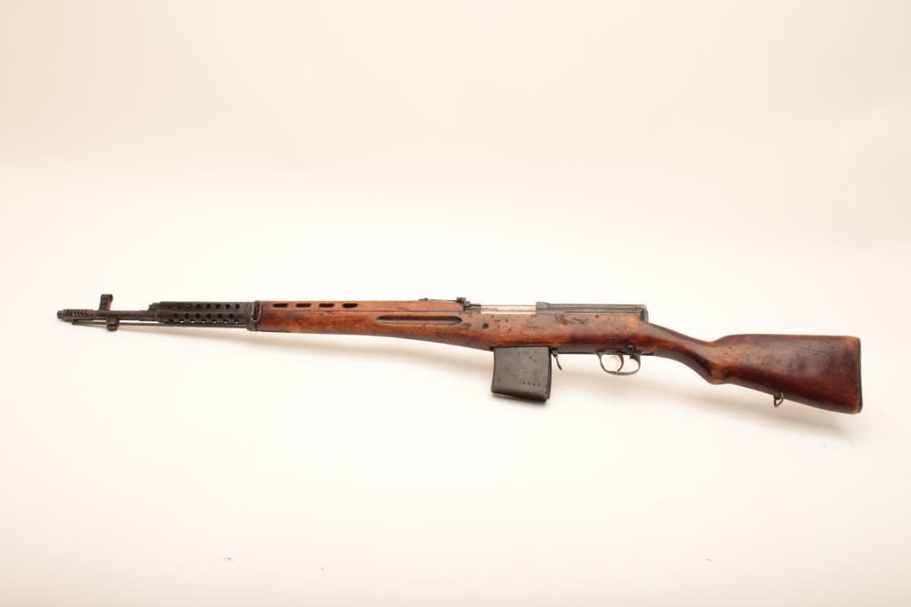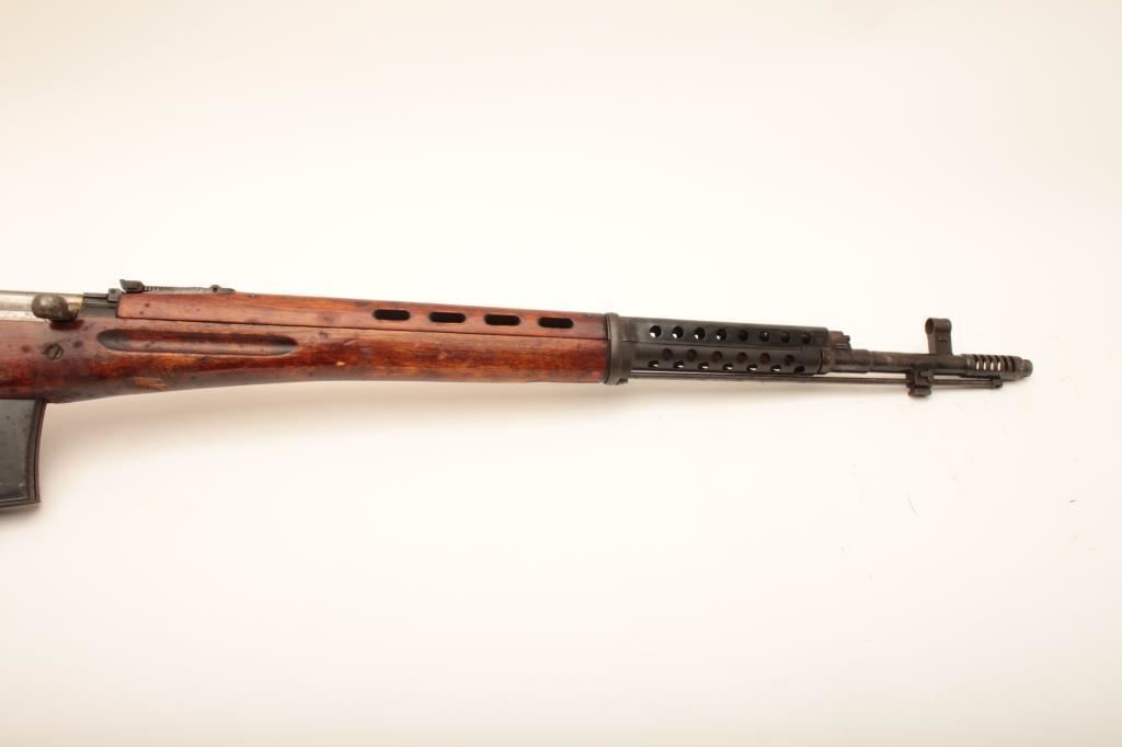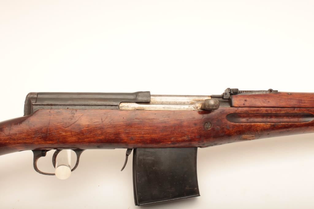Russian SVT-40 semi-automatic rifle, 7.62 x 54R caliber, Serial #4E2178. The rifle is in good overall condition with a 24” barrel with a hooded front and military tangent style rear sights. The metal surfaces retain the majority of their military finish with mars and thinning of finish on the barrel and mixed visible serial numbers. The receiver is marked with the Soviet Star and dated 1940. The smooth wood stock is in good condition showing heavy use with mars, dents and bruising. The butt stock has numerous cartouches and ends with a smooth steel butt plate. The bore is fair, the action crisp and markings are sharp on this desirable WWII era Soviet battle rifle. The lot includes one correct magazine. Est.: $800-$1,600. (C+R).