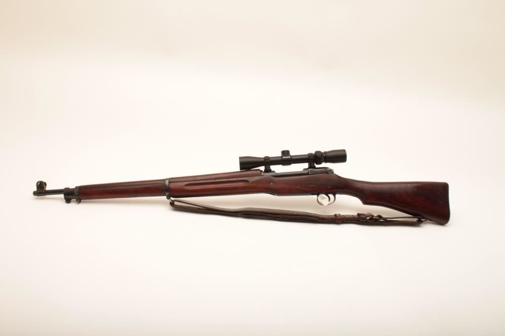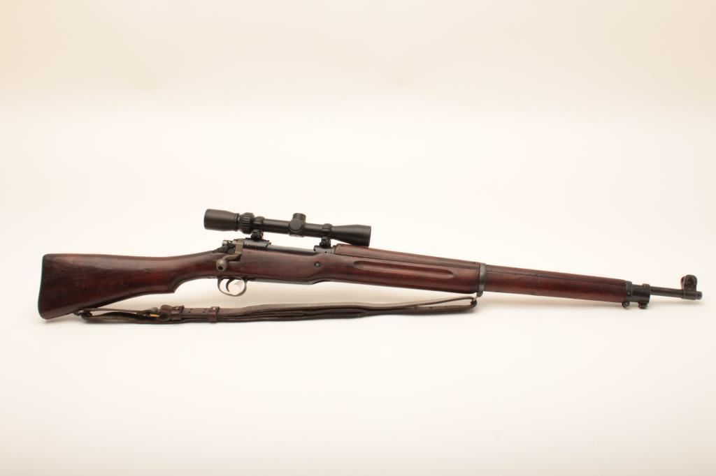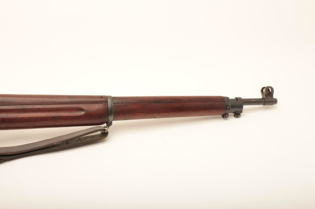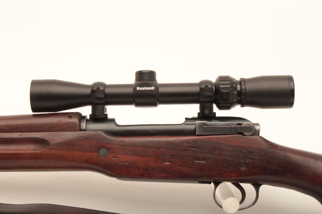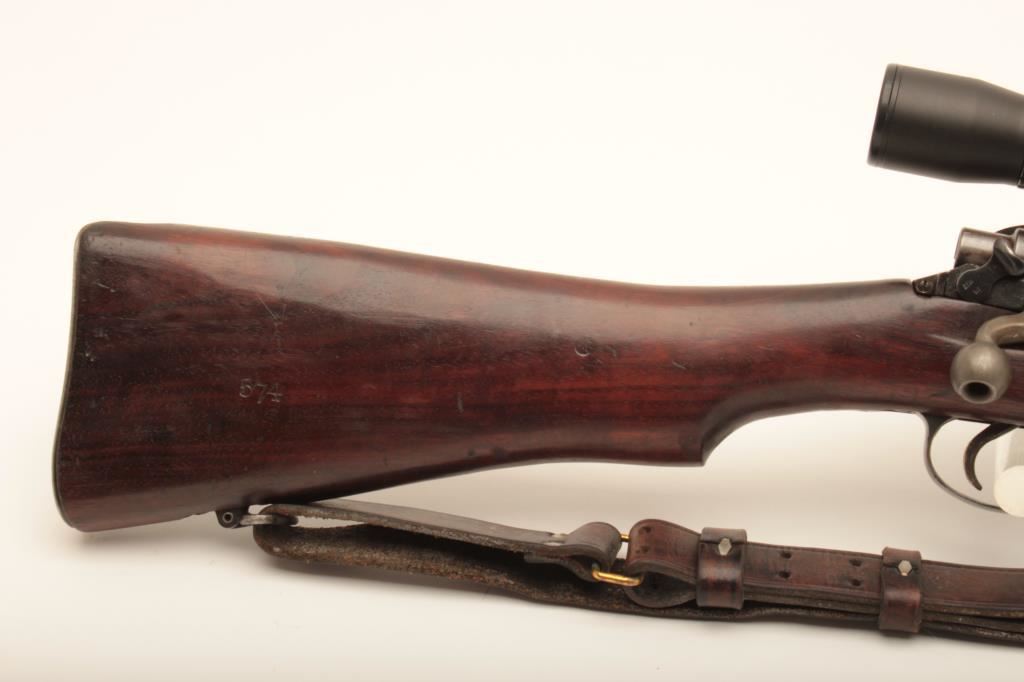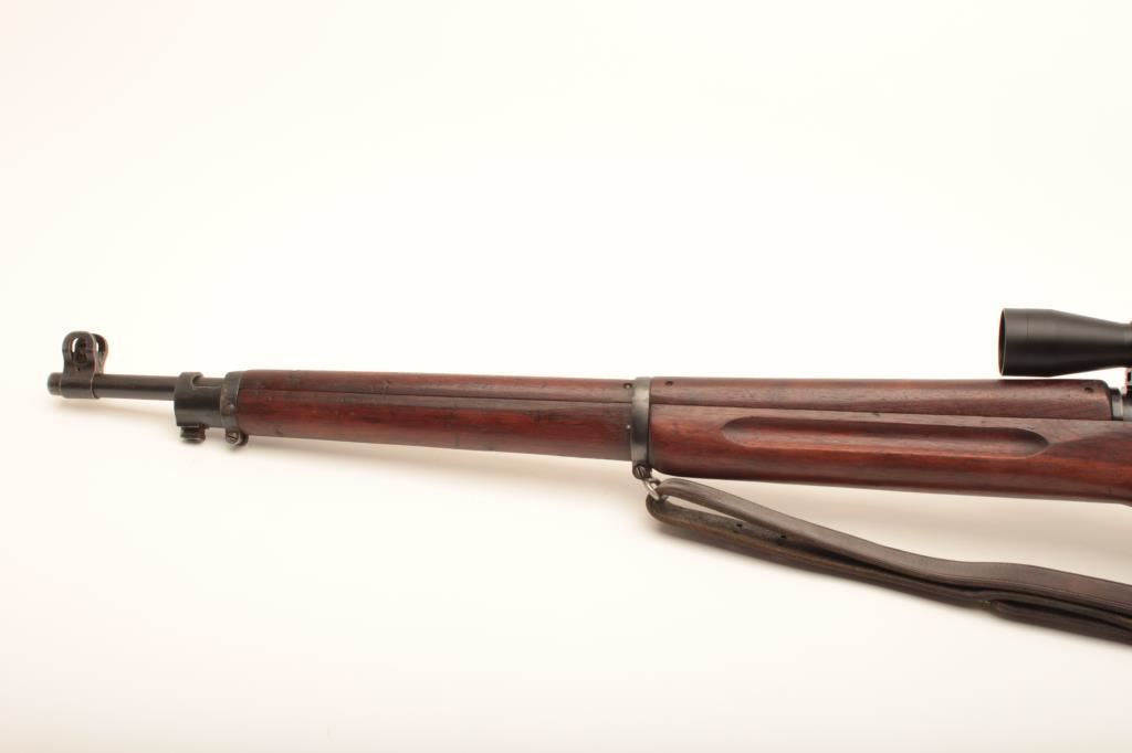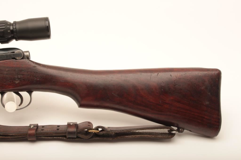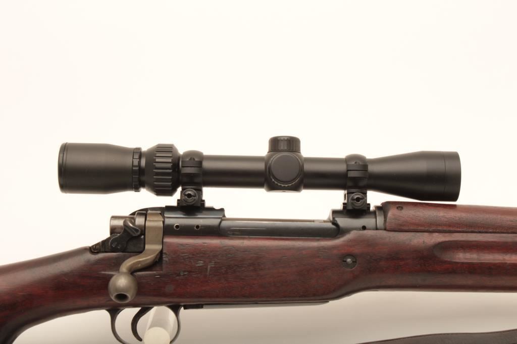 Enfield P-17 Sporting bolt action rifle, .30-06 caliber, Serial #NSNV. The rifle is in good overall condition as sporterized with a 26” barrel with the flaming bomb emblem, dated 8-18. The metal surfaces retain the majority of their military finish with two extra holes drilled at the rear of the right side of the receiver. The smooth wood stock is in good condition with numerous cartouches, mars and compressions consistent with field use. The rifle is topped with a Bushnell 3 x 9 variable power scope. Additionally, the lot includes sling swivels and a period leather military style sling. The bore is fair, the action is crisp and markings are sharp. Est.: $200-$400. (C+R).