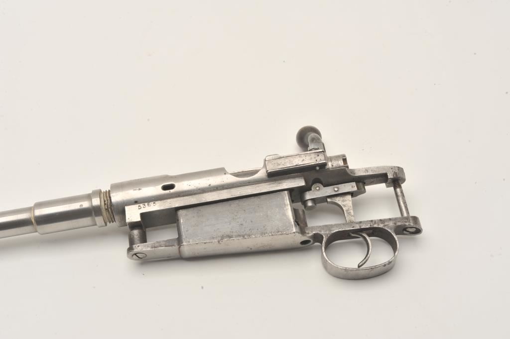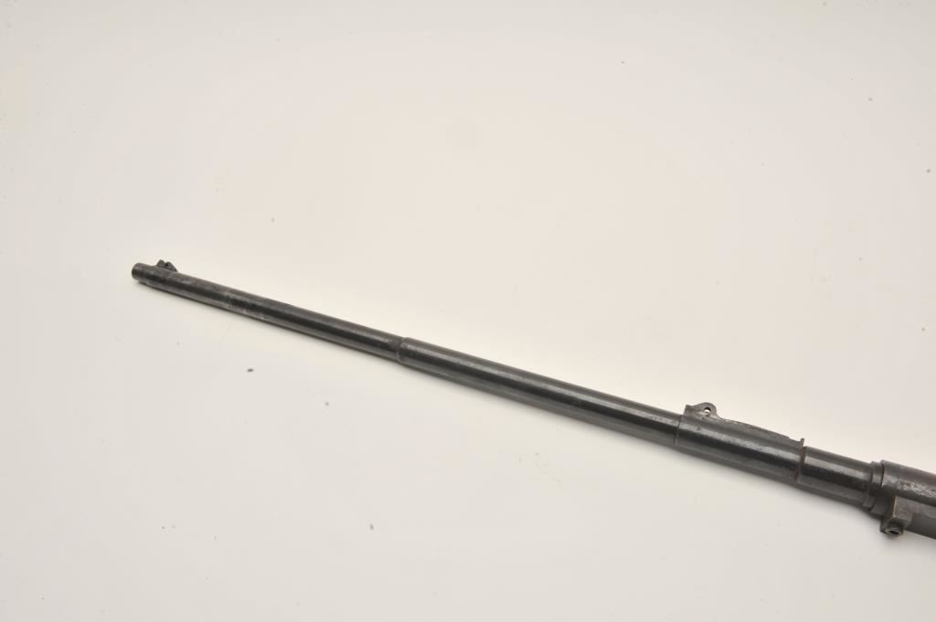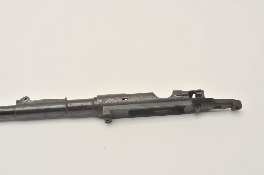 Mexican Model 1910 Mauser barreled receiver, 7mm caliber, Serial #2275. The lot includes a 29” barreled action with a 1931 dated Mexican Mauser action, front and rear sights removed. The front ring features the Mexican crest and is dated 1931. The barrel and receiver both show significant light surface rust. The receiver is missing the internal parts and shows light to moderate pitting beneath the wood line. The bore is just fair. Mexican Model 1936 Mauser barreled action, 7mm caliber, Serial #5365. The lot includes a 24” barreled action with a 1948 dated Mexican Mauser action, front and rear sights removed. The front ring features the Mexican crest and is dated 1948. The barrel and receiver are both in the white with sharp markings. Mexican Model 1936 Mauser barreled receiver, 7mm caliber, Serial #68641P. The lot includes a 24” barreled action with a 1944 dated Mexican Mauser action, front and rear sights removed. The front ring features the Mexican crest and is dated 1936. The barrel and receiver both show the majority of their blue finish with