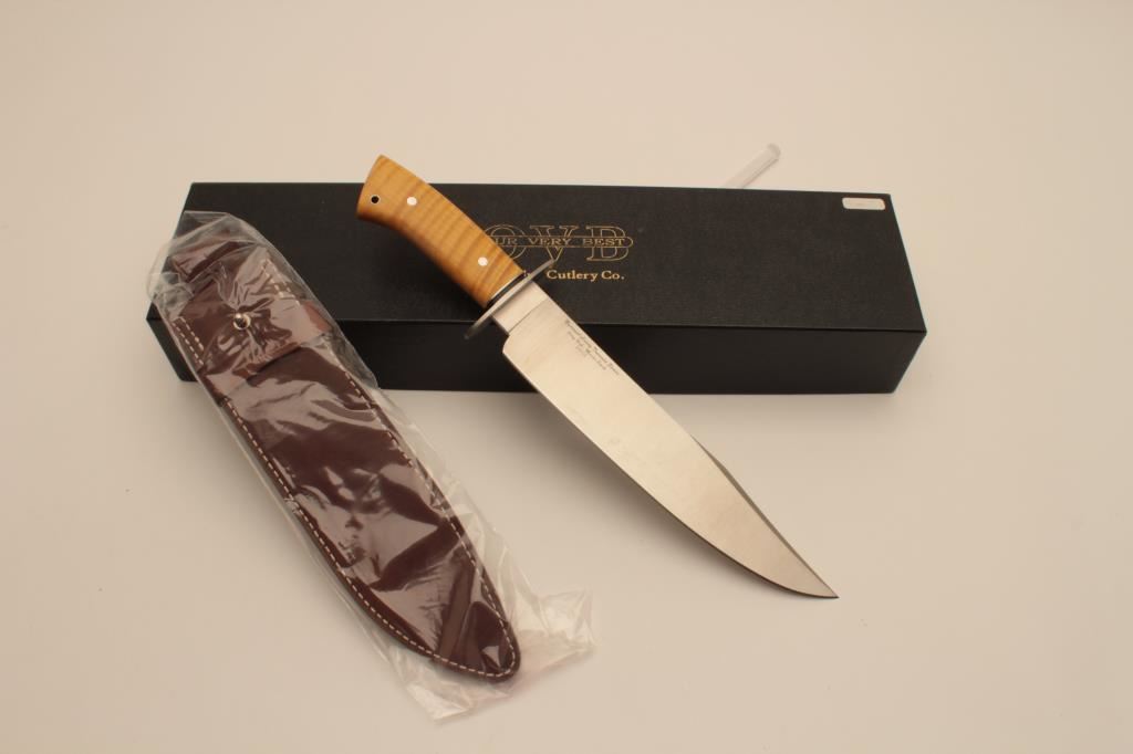 2002 Camillus “Our Very Best” knife with clip point blade and tiger maple grip. Jerry Fisk signed and 2003 dated. Measures 16 ½” overall with a 11 ¼” blade. Est.: $200-$400