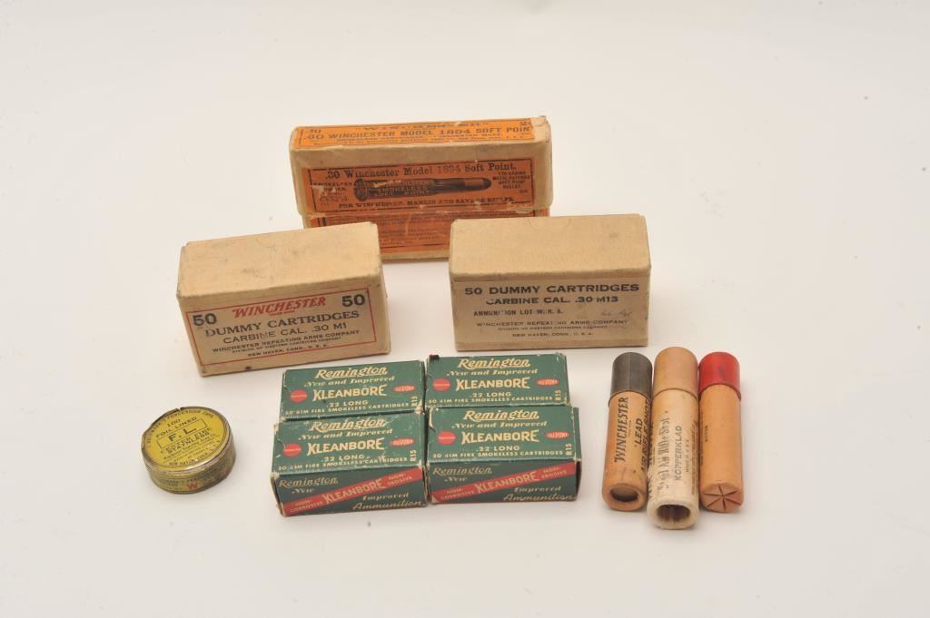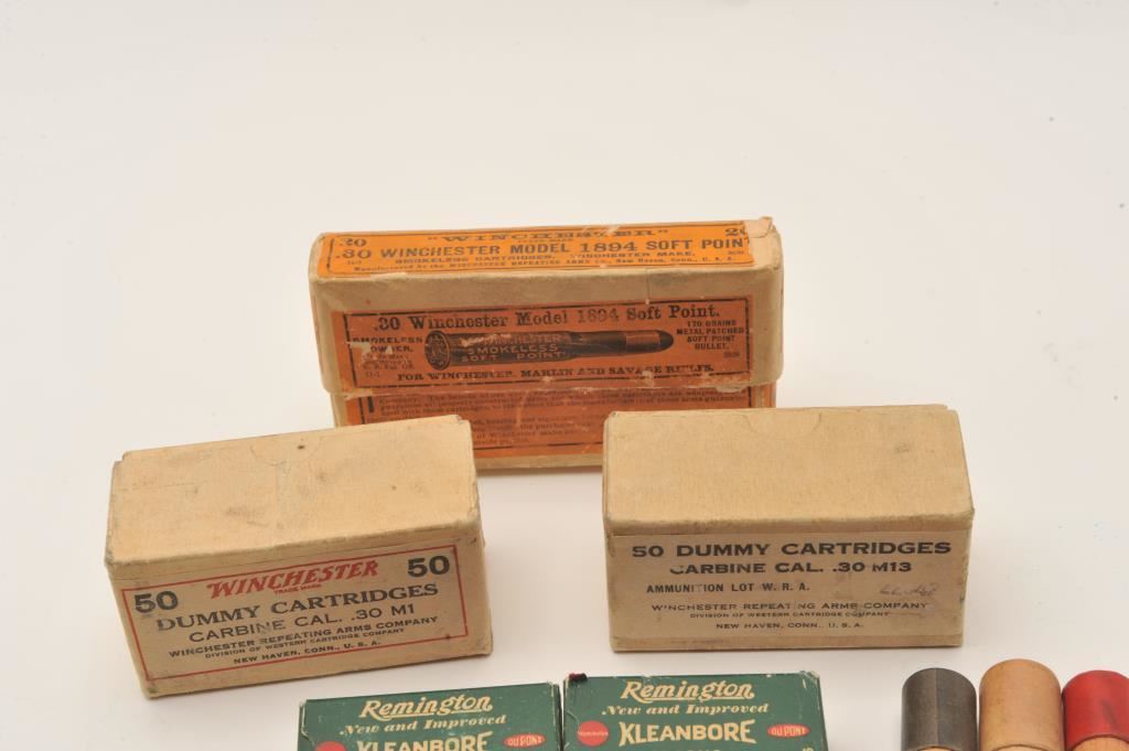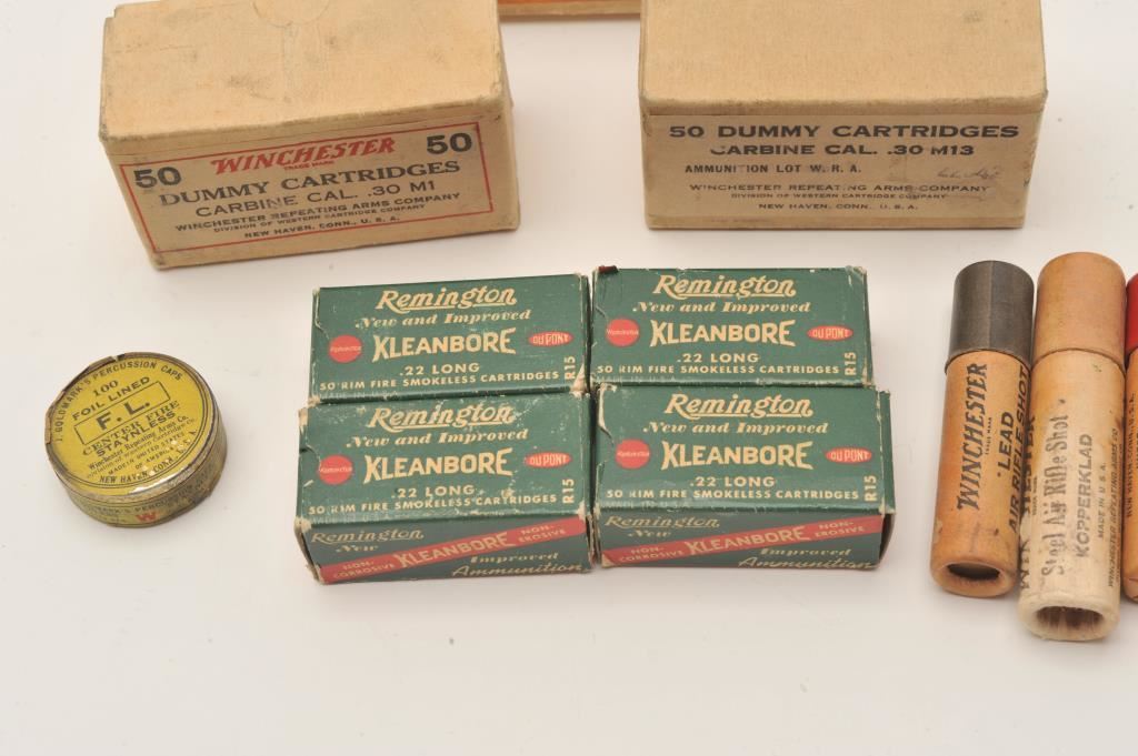Small lot of collectible ammo including 2 boxes of .30 M1 caliber carbine dummy cartridges, a box of Winchester Model 1894 .30 caliber cartridges, 4 boxes of Remington .22 Long cartridges, a cap tin and 3 round containers of Winchester Air Rifle shot. Est.: $100-$200.