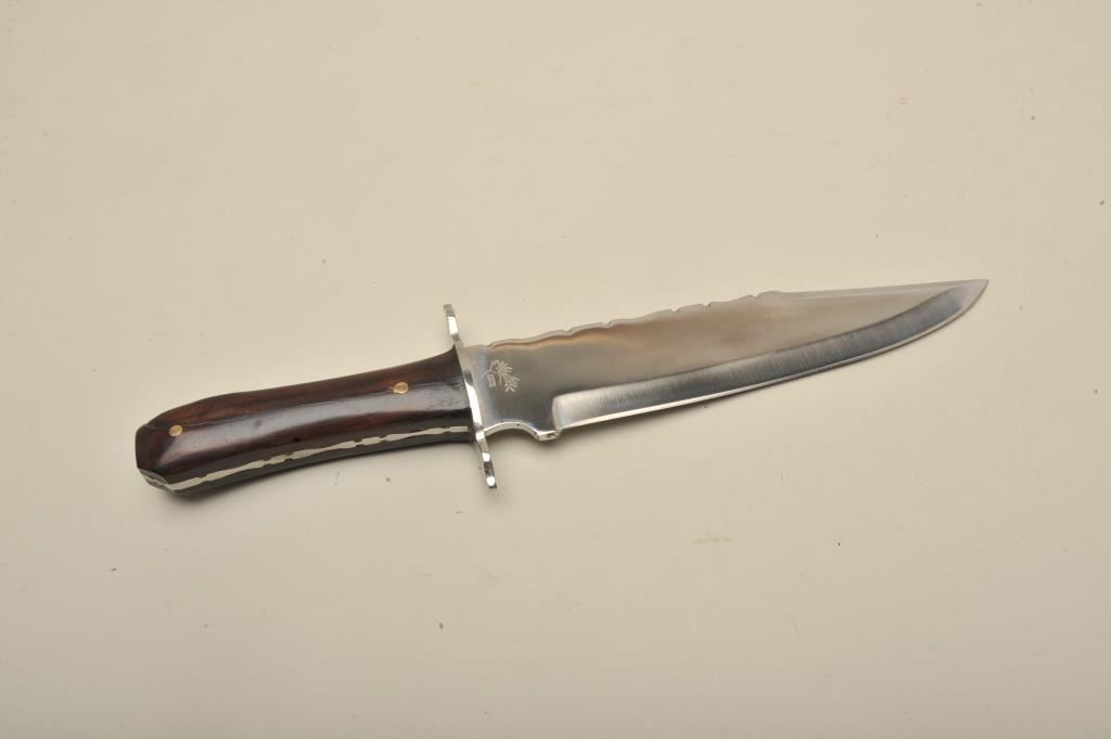 Jacobs custom marked clip point 19th century style bowie w/scabbard marked Giles, Virginia city, Montana. 14" overall, 9.25" blade, fancy wood scales in coffin shape. Shows slight sharpening. Very good plus.