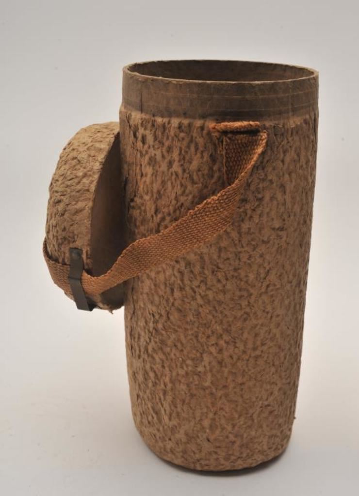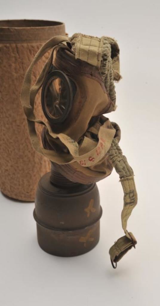 Gas mask and case marked on the bottom of the can “C.P. 1935M” complete showing sun and heat aged. Fair to good condition. Est.: $50-$100