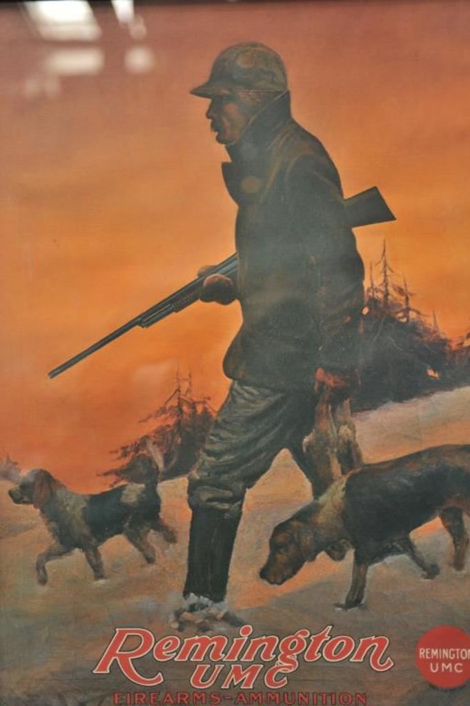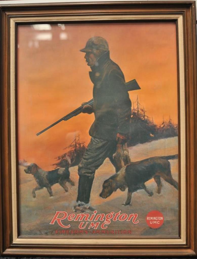 Framed vintage Remington UMC advertising print. The piece is in good overall condition with some cracking noted. The piece measures 28” by 22” and is framed. The piece depicts a hunter in the snow carrying his Remington shotgun accompanied by his trusty dogs. A nice piece that would benefit from some TLC. $100-$200.