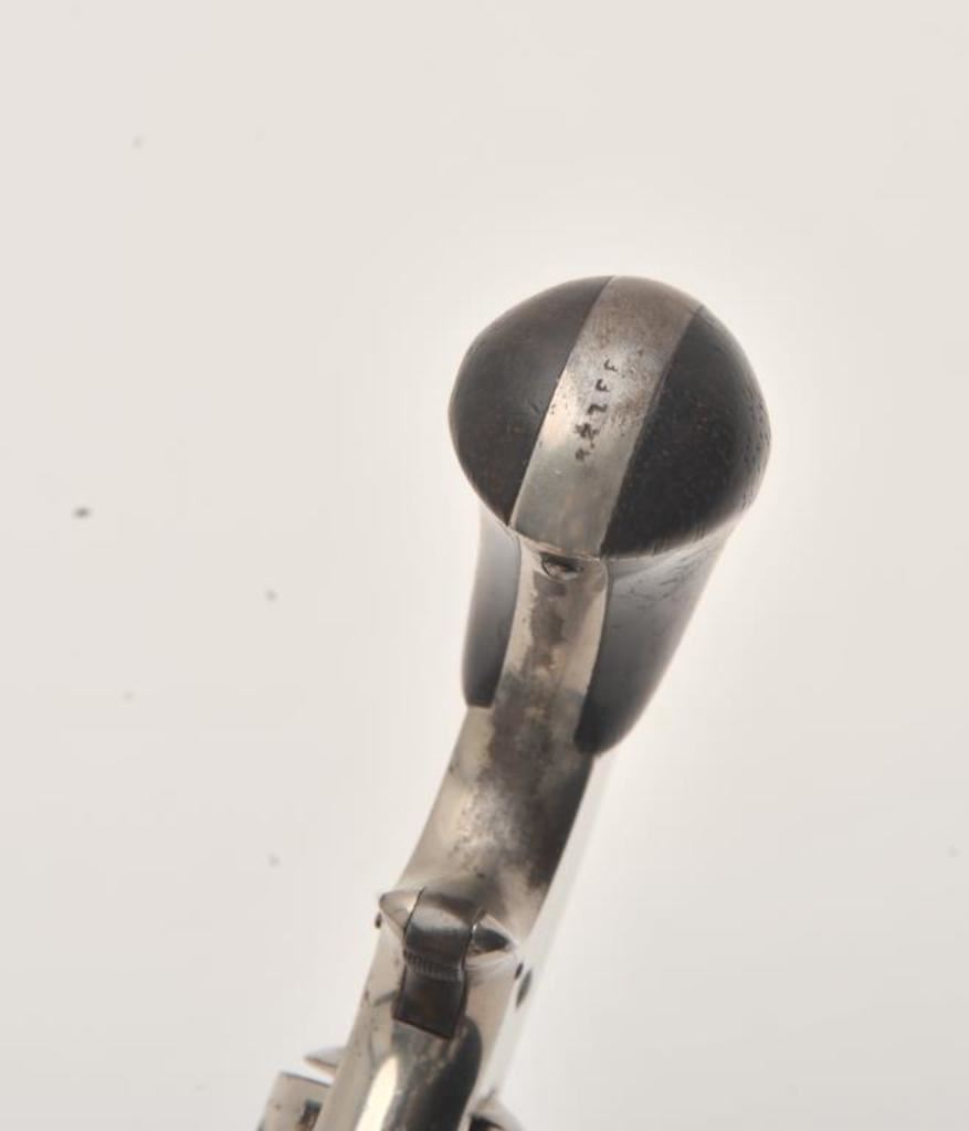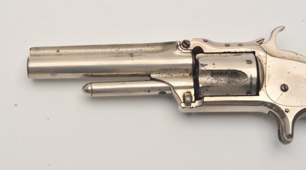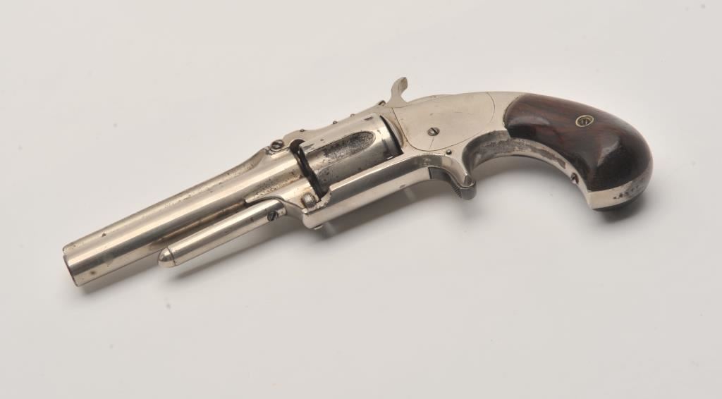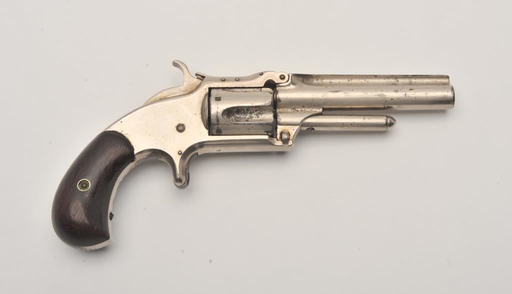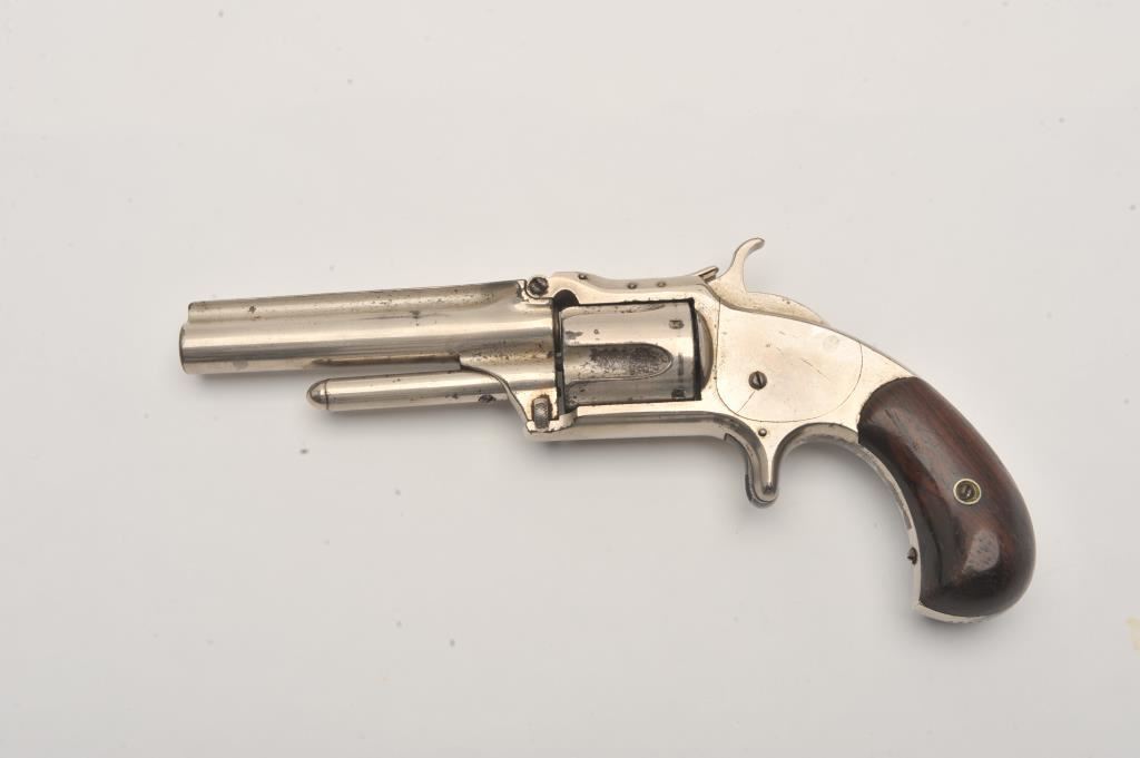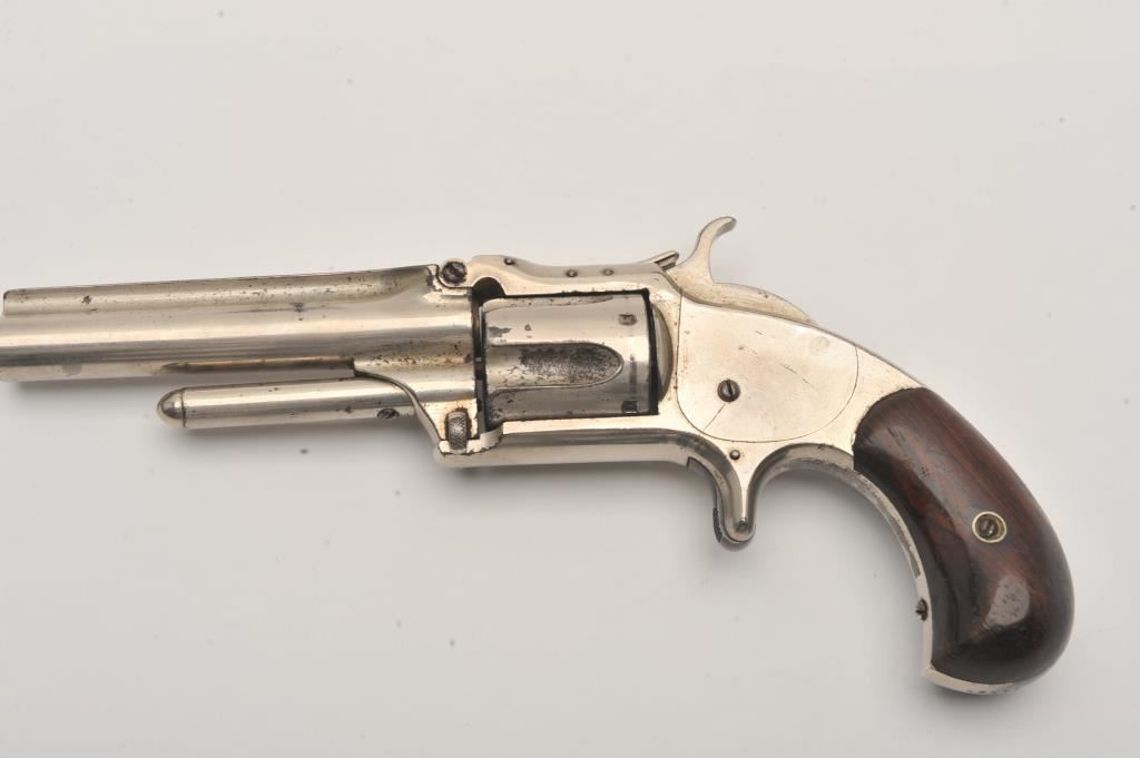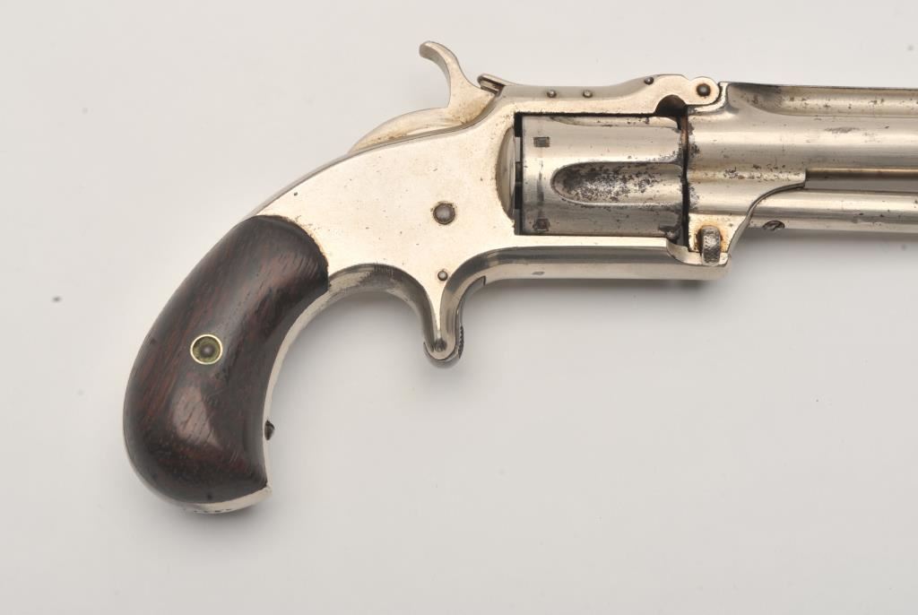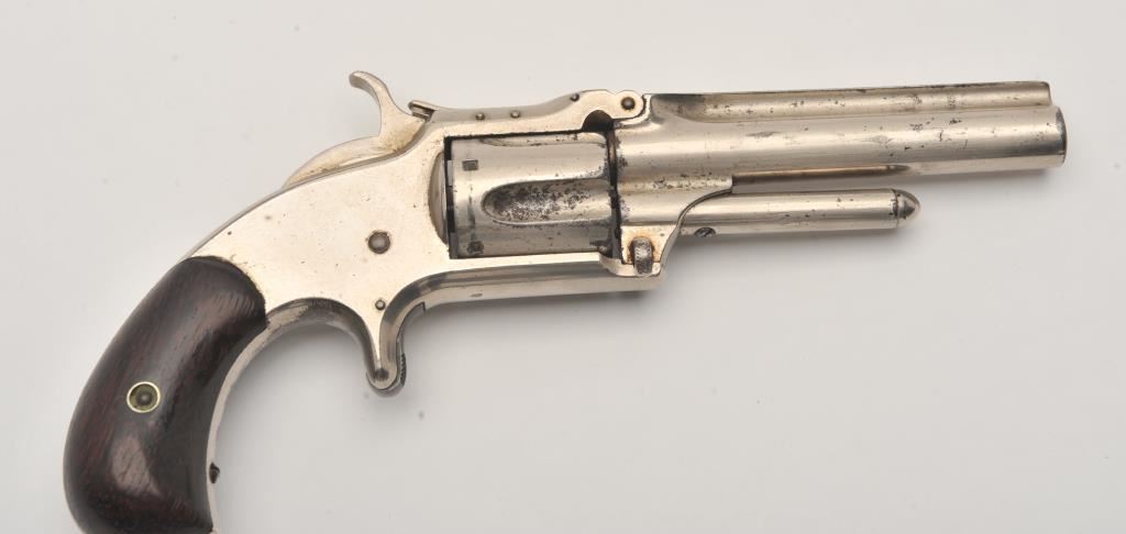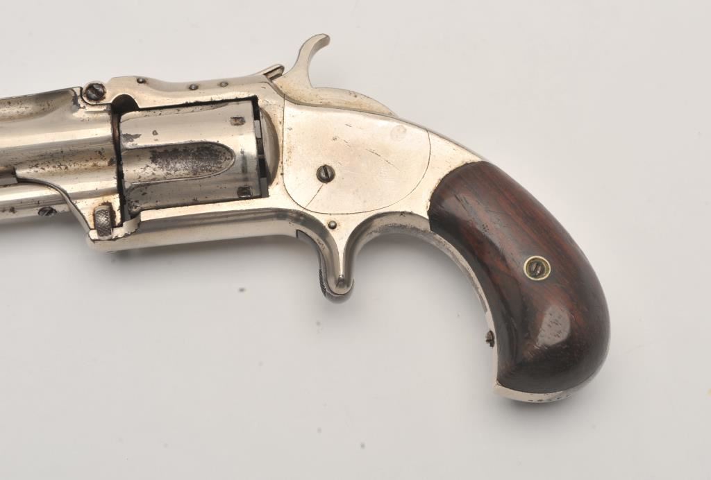 Smith & Wesson spur trigger 2nd Model No. 1-1/2 revolver, .32RF caliber, 3.5” barrel, nickel finish, wood grips, S/N 33129; overall good condition with of nickel finish remaining, fair bore, good action and markings, good grips. (Antique). Est.: $250-$500.