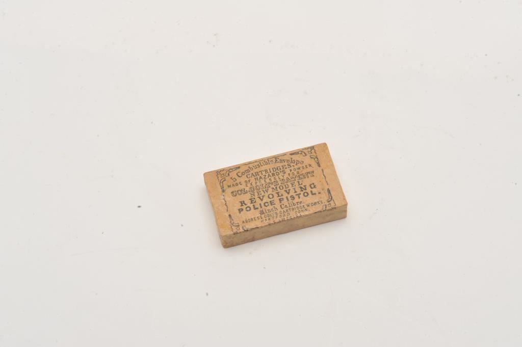 Cartridge pack by Colt’s Cartridge Works, Hartford for New Model Police revolving pistol. Authentic and unopened. Near fine. Slight staining and aging. Est.: $400-$800