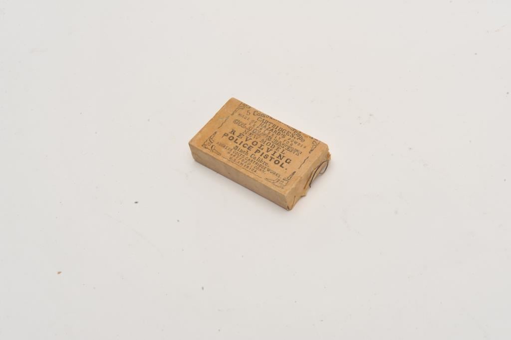 Cartridge pack by Colt’s Cartridge Works, Hartford for New Model Police revolving pistol. Authentic and unopened. Near fine. Slight staining and aging. Est.: $400-$800