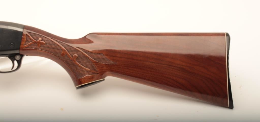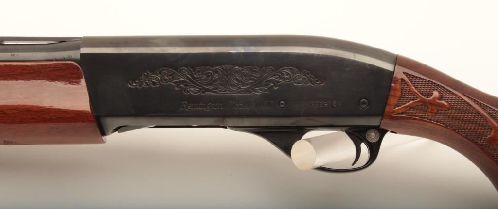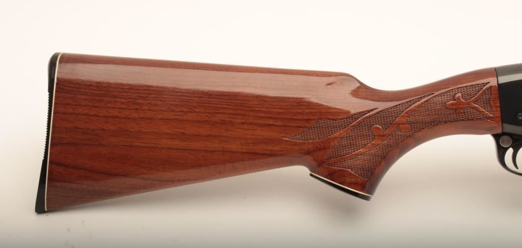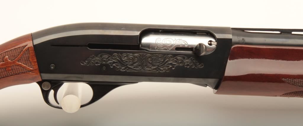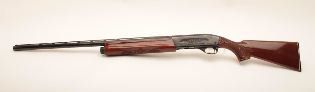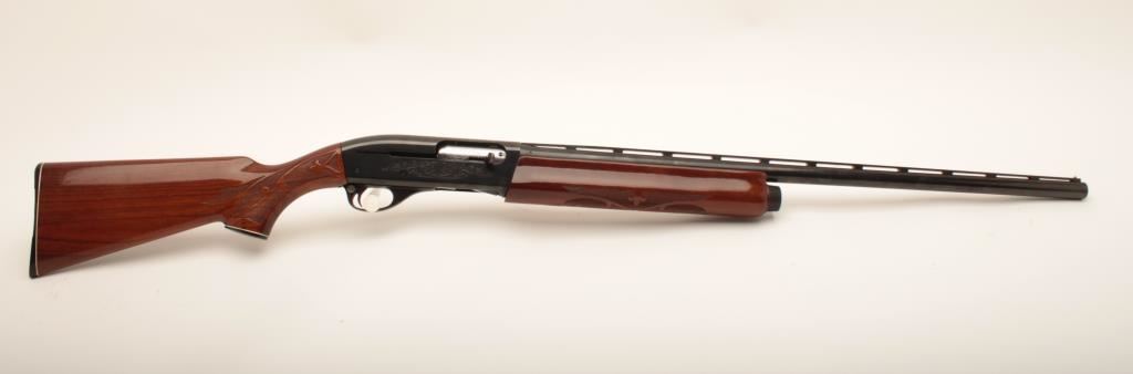 Remington 1100 #N232912V, 12 Ga., 28" vent rib barrel chabered for 2 3/4" shells, modified choke, blued finish, embossed checkered walnut stock with plastic butt plate. Shotgun is in near excellent condition overall, bore is bright, action is good, stock is near excellent with minimal handling marks. LOP is 14 1/8". (Modern) Est. $300-600