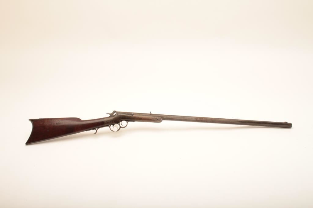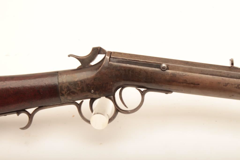 Frank Wesson two trigger single shot rifle, approximately .32 caliber, 28” octagon barrel, dark patina, wood butt stock, S/N 876; overall fair to good condition with working action although the ejector system is in need of repair, fair + bore, good action and good wood stock; brass-lined small post opening for tang sight at top of butt stock in front of comb. (Antique). Est.: $500-$1,000.