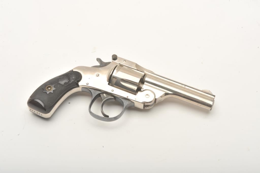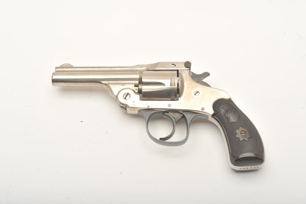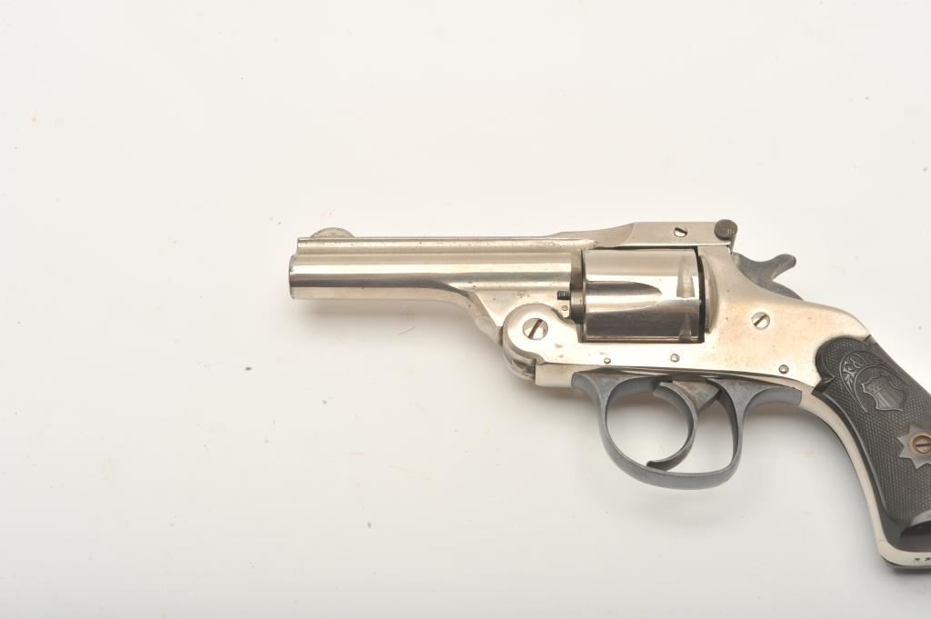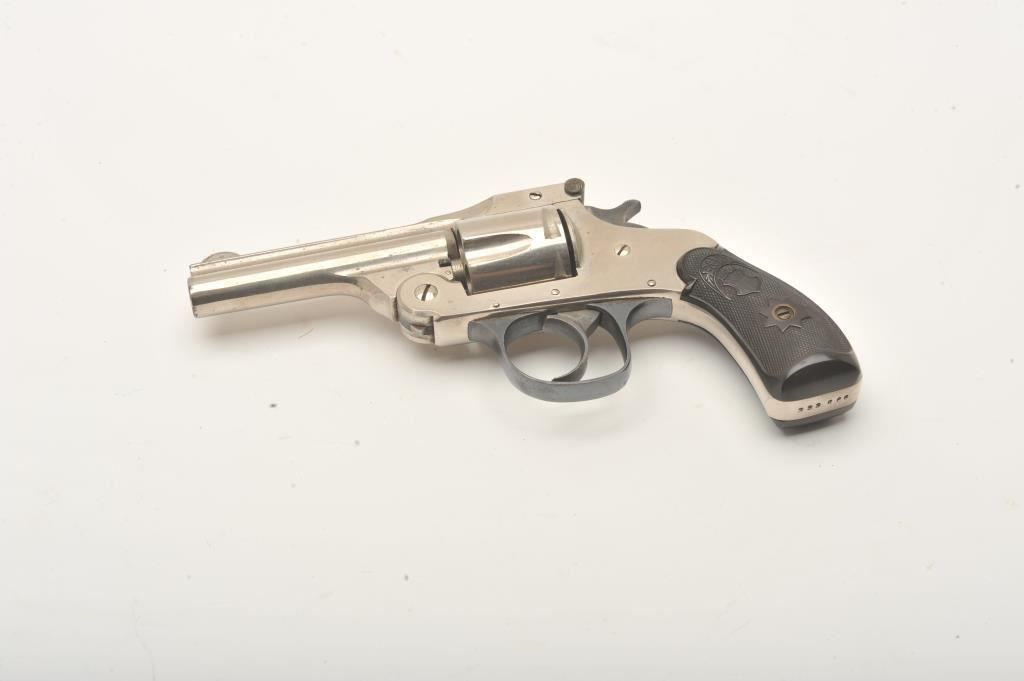 Forehand Arms Co. top break DA revolver, .38 caliber, 3.25” barrel, nickel finish, checkered black hard rubber grips, S/N 333666, overall very good to near fine condition with majority of original nickel finish remaining, crisp action, sharp markings, bore may clean to very good +, near fine grips. (C&R). Est.: $175-$375.