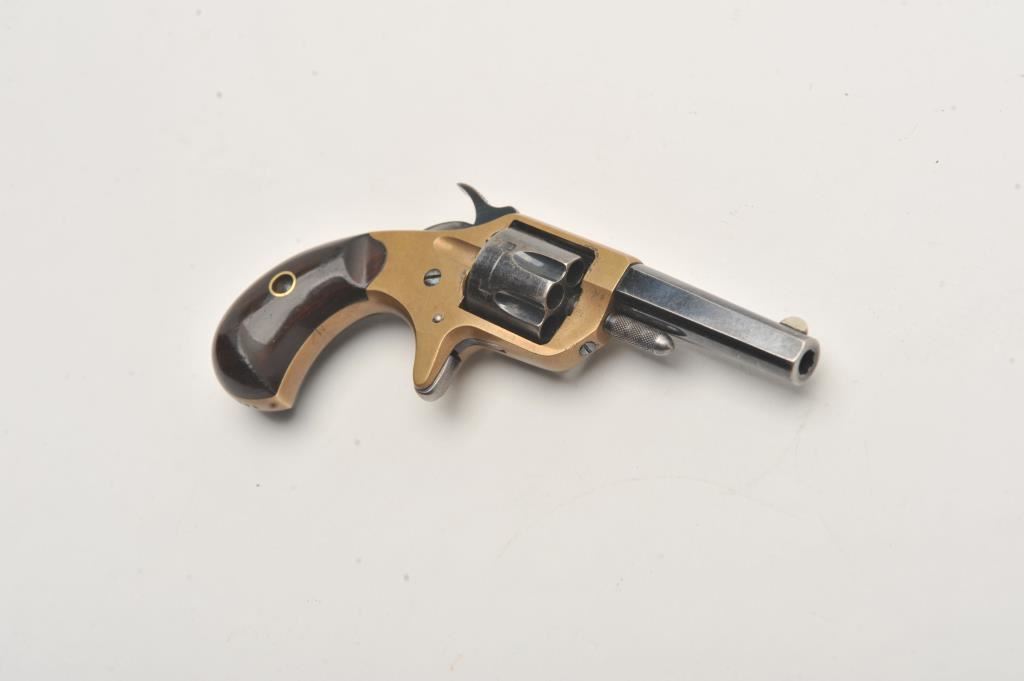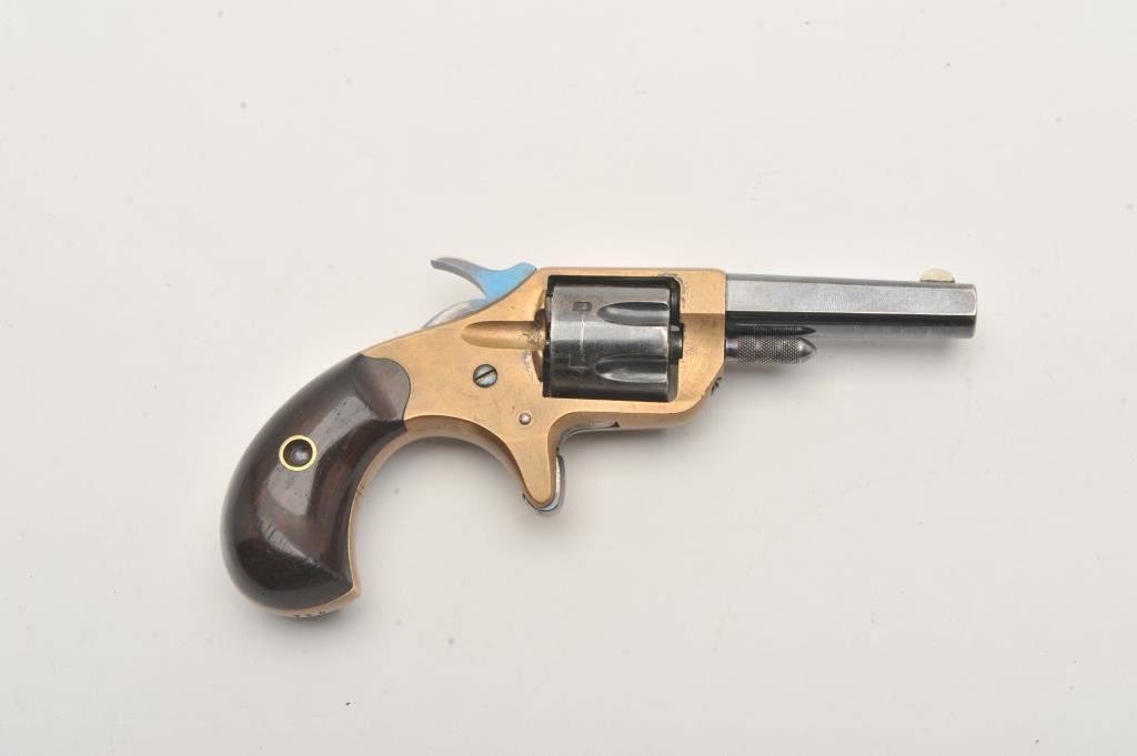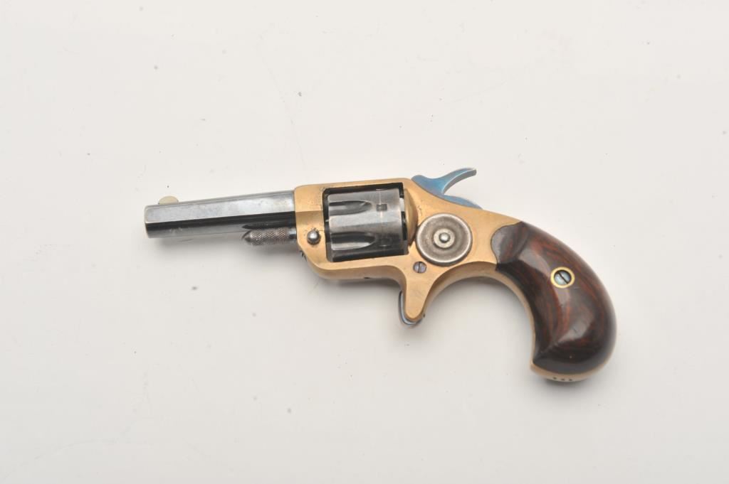Colt New Line spur trigger revolver, .22 caliber, blued barrel and cylinder, brass frame and wood grips, S/N 741; overall very good condition with majority of blued finish on barrel and cylinder, taffy colored patina to brass frame, hammer cocks but does not advance cylinder; very good grips. (Antique). Est.: $250-$500.