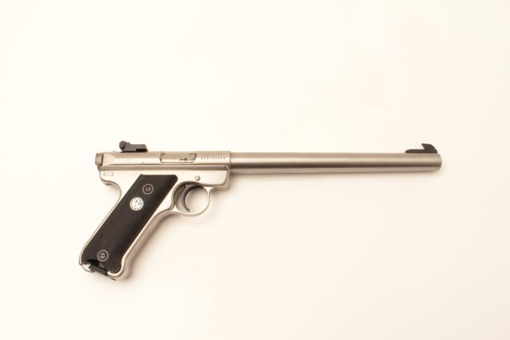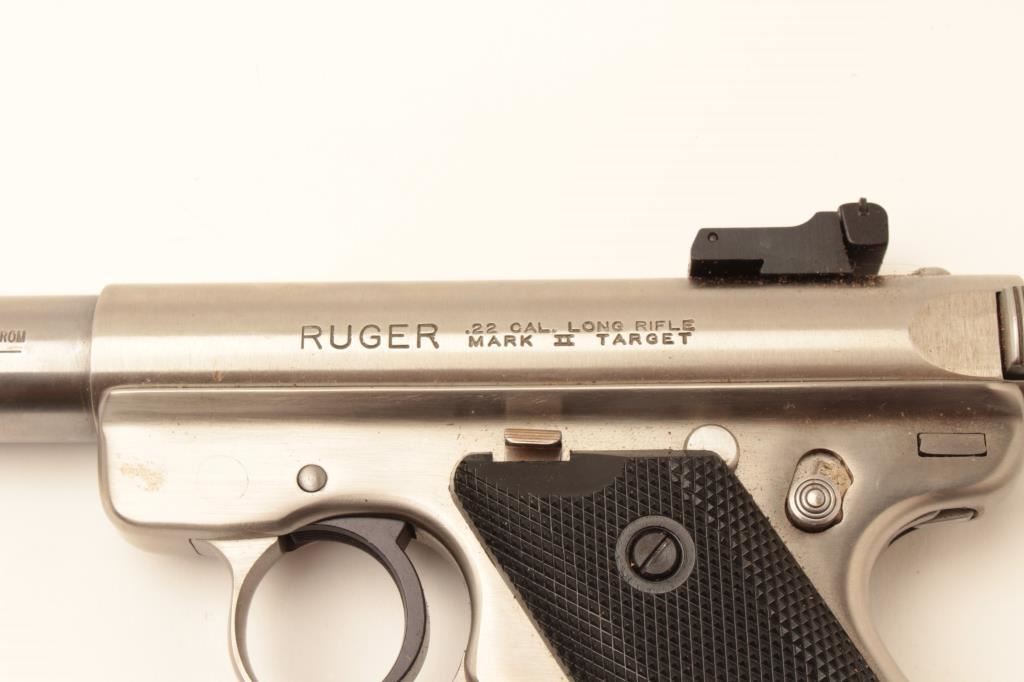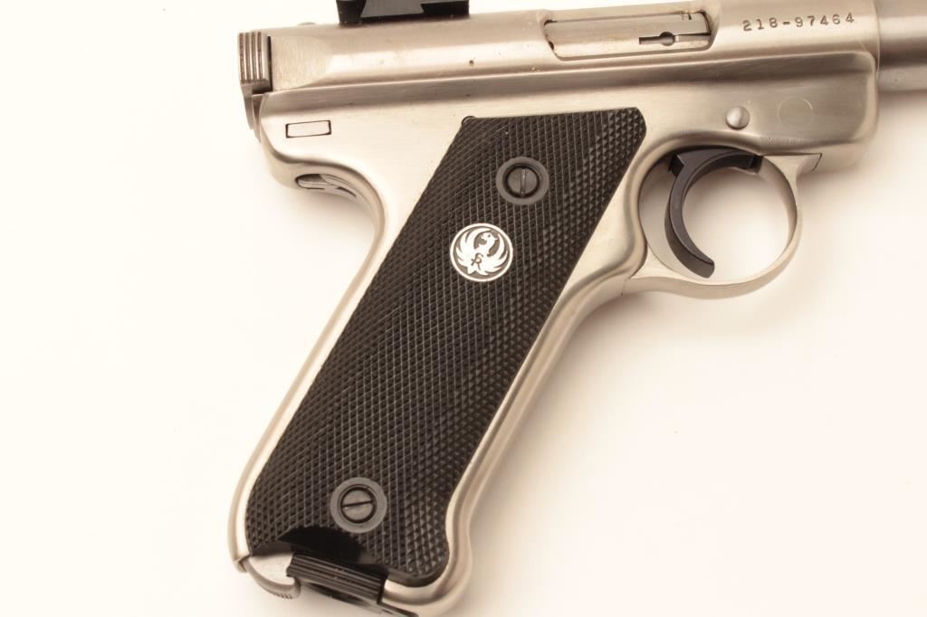 Ruger MK II Target semi-automatic pistol, .22LR caliber, 10” barrel, stainless, checkered black Ruger medallion grips, S/N 218-97464; overall fine condition with factory hardcase, instructions and one extra magazine. (Modern/PPT). Est.: $300-$500.