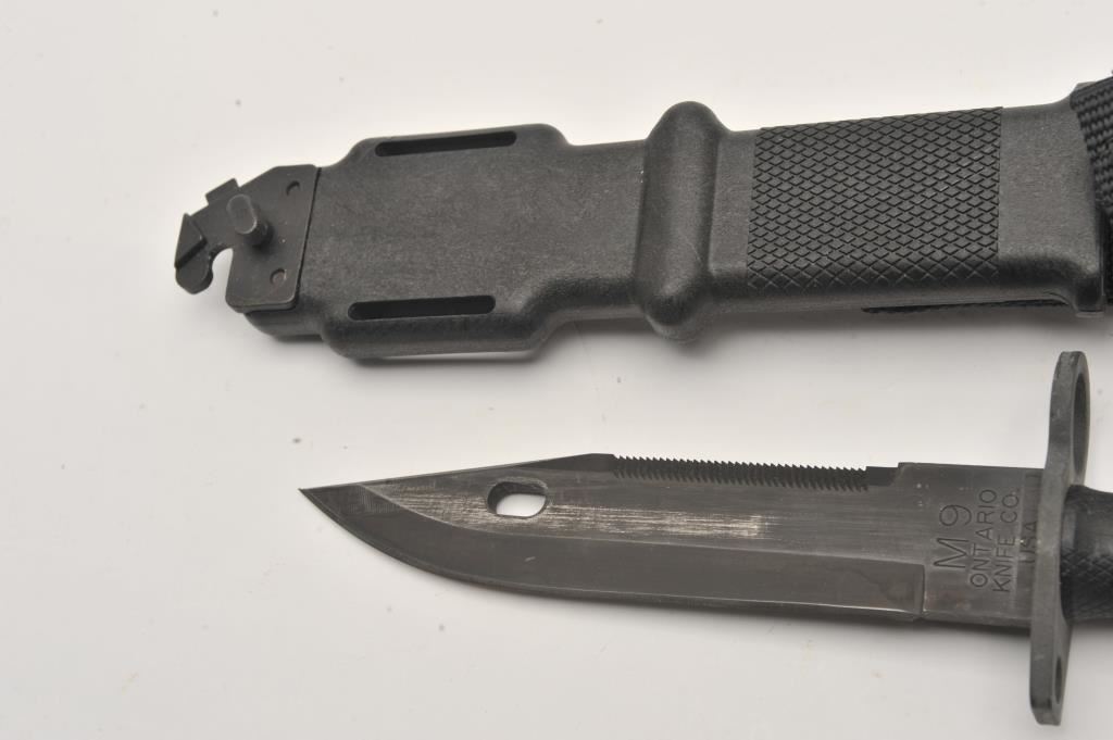 M-9 military knife with sheath and woven hanger by Ontario Knife Co.; overall very good to near fine condition. Est.: $100-$175.