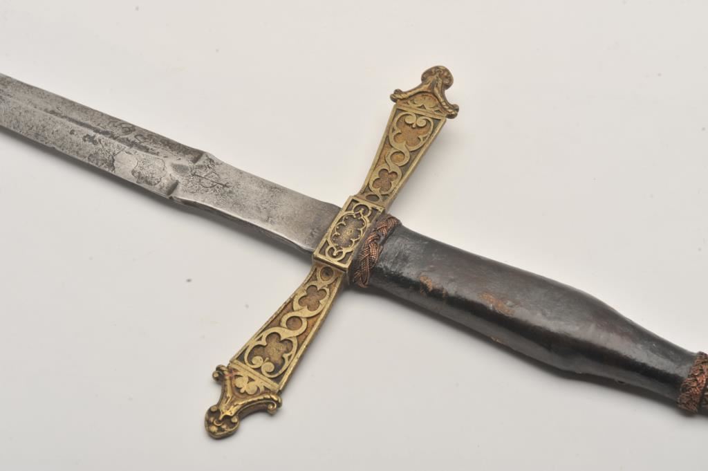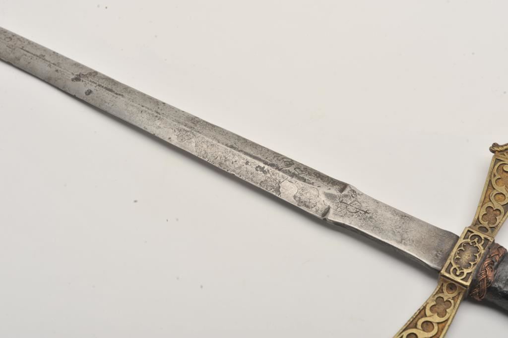 Knightly sword in 17th century style showing makers mark on the blade with cast brass mounts and leather grips with copper wire wrap. The sword measures 42” with a 33 ¼” blade. Shows age but possibly a Victorian assemblage using older blade and very authentic in styling, balance and weight. Est.: $300-600