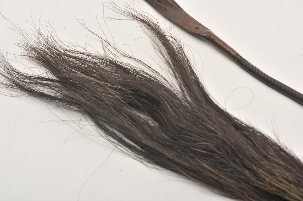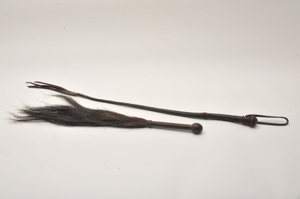 Lot of 2 old braided leather Western era quirts; great decorators for the tack or Western theme room. Est.: $100-$200.