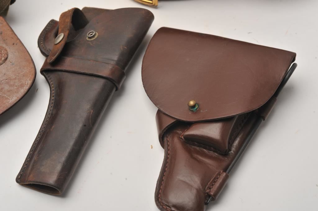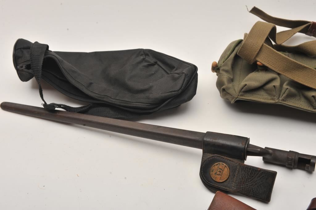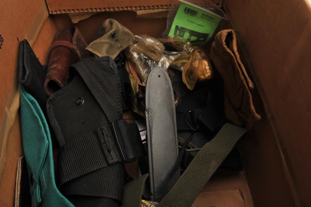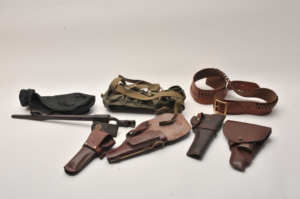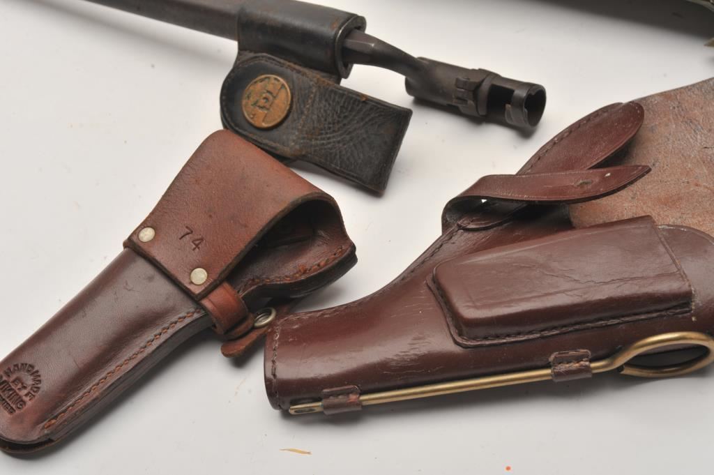 Bonanza lot of misc. holsters, several after-market magazines, misc. military web gear, a socket bayonet, scabbard and hanger marked NGP, etc.; great for the gun show circuit. Est.: $150-$300.