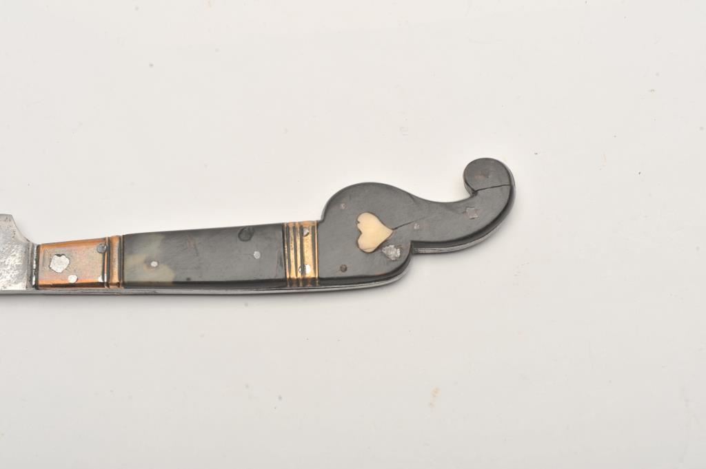 Unusual Antique Knife possibly American with polished 4 and 1/2 inch clip point and five point star armorer's mark. Copper bolsters and buffalo horn scales with inlaid hearts. 9 and 1/2 inches overall. Interesting 19th century knife. Est:$100-150