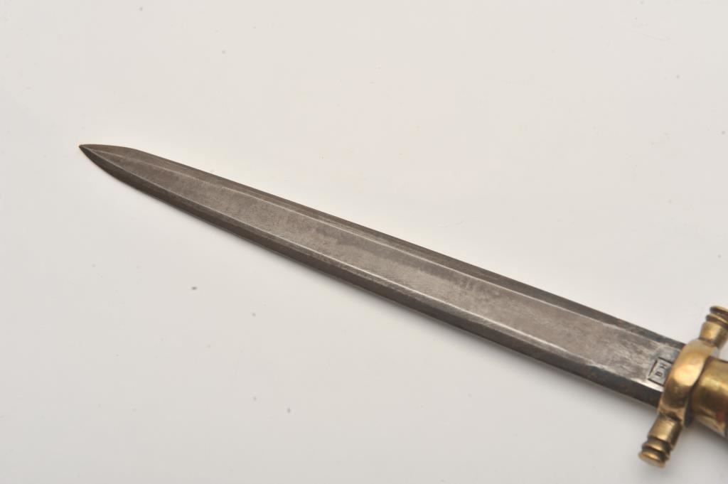 17th to 18th century “Plug” bayonet with “B.H.” mark on the pommel. Grip and pommel cap replaced to use as a knife in later era. Measures 14 ½” overall with a 9 ½” blade. In good condition. Probably Spain or Italy. Est.: $200-400
