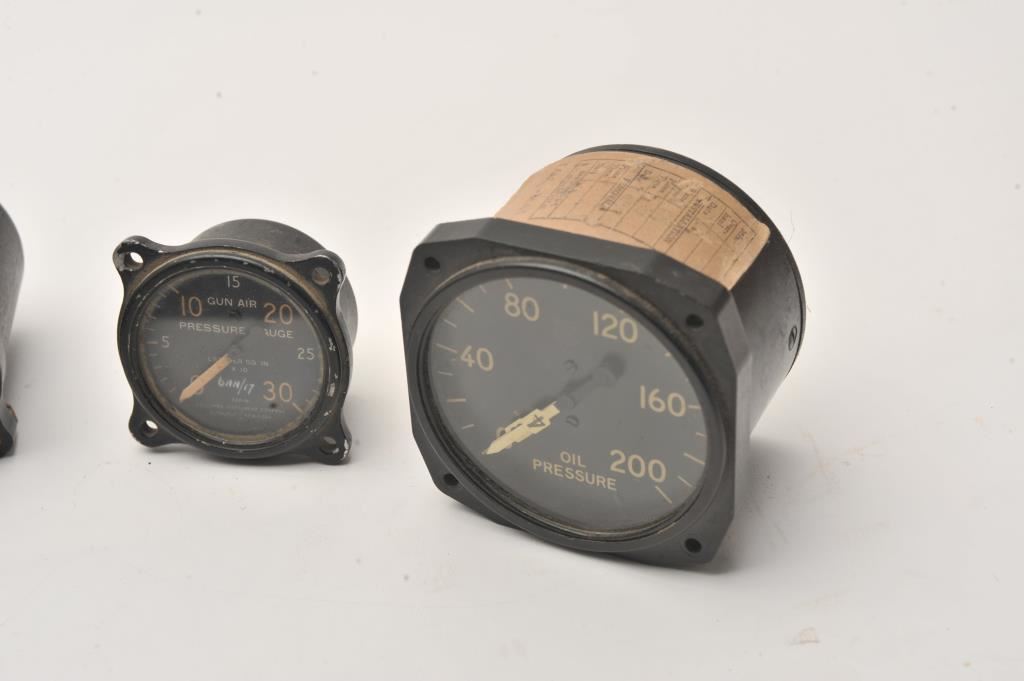 7 WWII Aviation gauges from P 37, 38s and other aircraft. 50 cal. Empty round. Est.: $100-$200