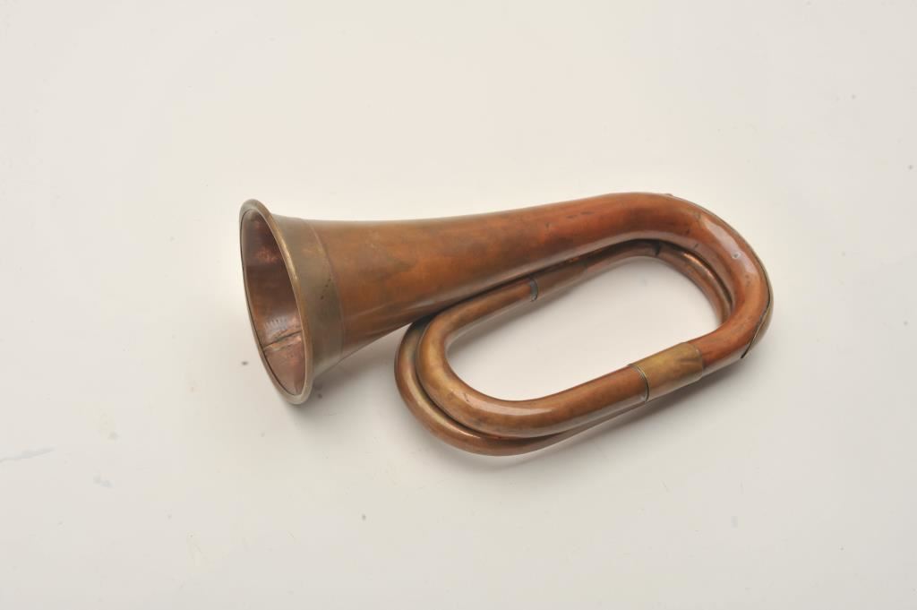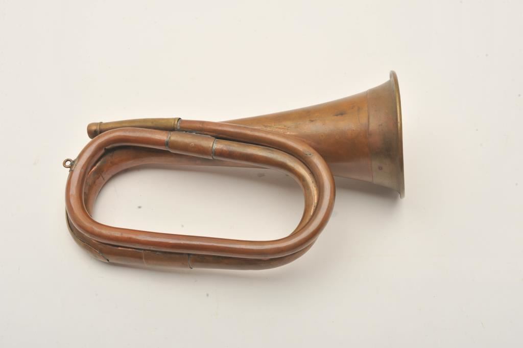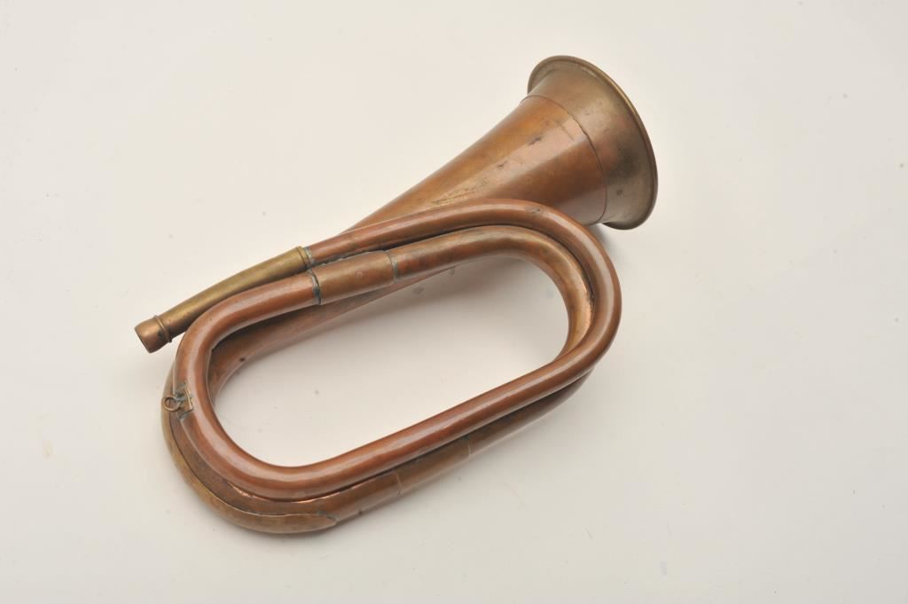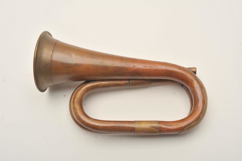 Cavalry style brass bugle, approximately 12” overall with mouthpiece, beautiful taffy colored patina, no visible markings. Est.: $250-$500.