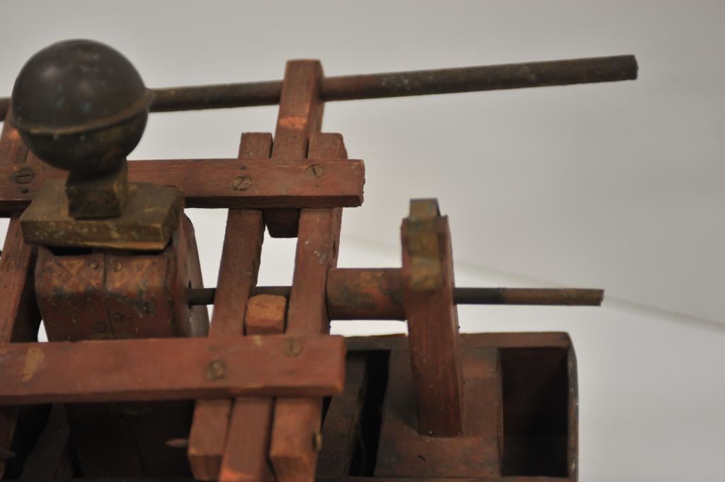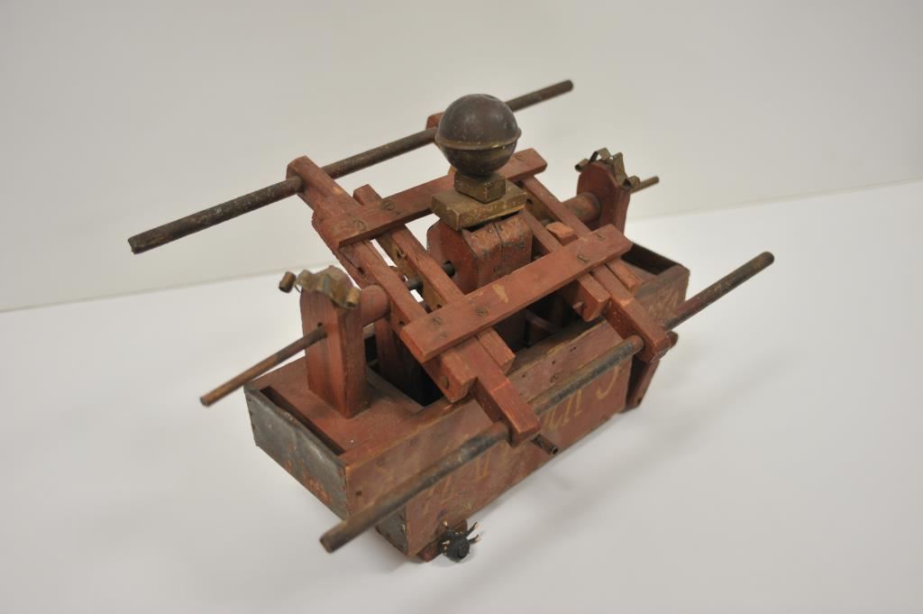 Wooden Patent Model appearing to possibly be a hand operated water pumping device marked “Hancock 5” on each side of body; approximately 18” long and 12” in height; missing 3 wheels; remaining wheel is broken; no patent tag. Est.: $100-$175.