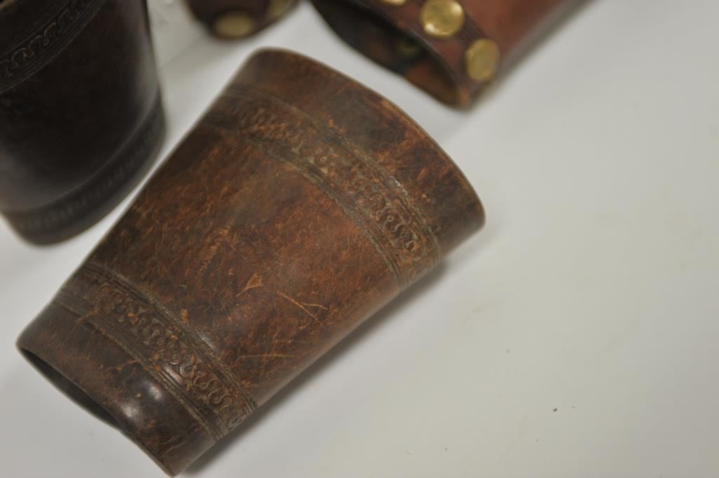 Two pair of leather wrist cuffs; one tooled and in good uncleaned condition; another edge tooled with large brass studs and brass shield five point stars in good condition overall. Est.: $125-$250.