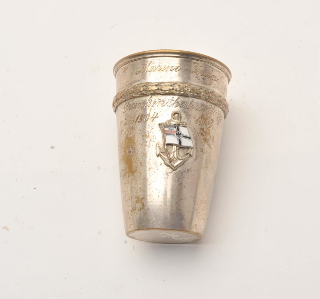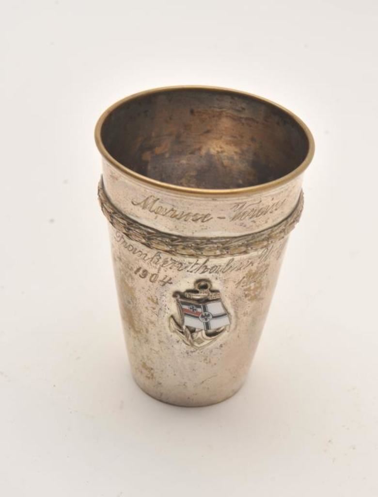 Inscribed toasting cup with enamel navy emblem and anchor. In script inscribed “Marme Verein, Fromkenthol Unig 1904-1929”. Measures 4” in height. Silver over brass. Great enamel work. Est.: $150-$300