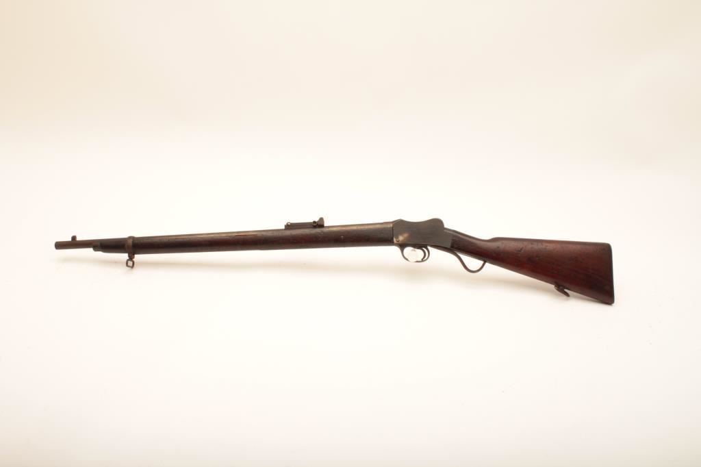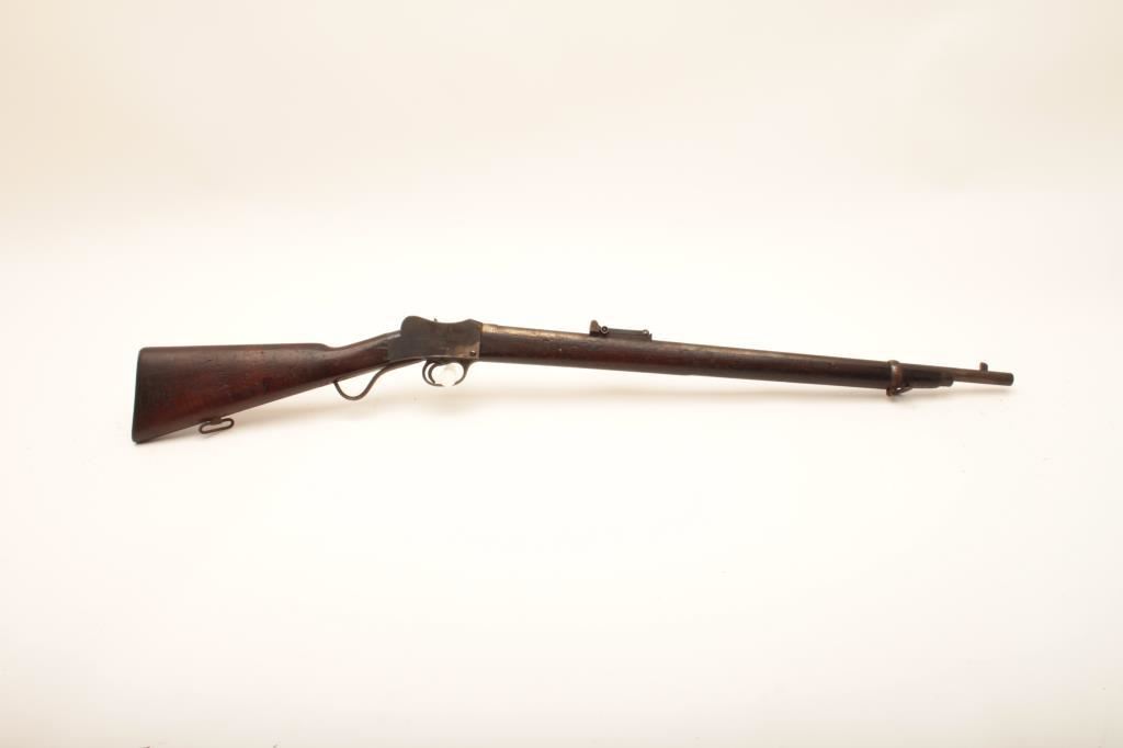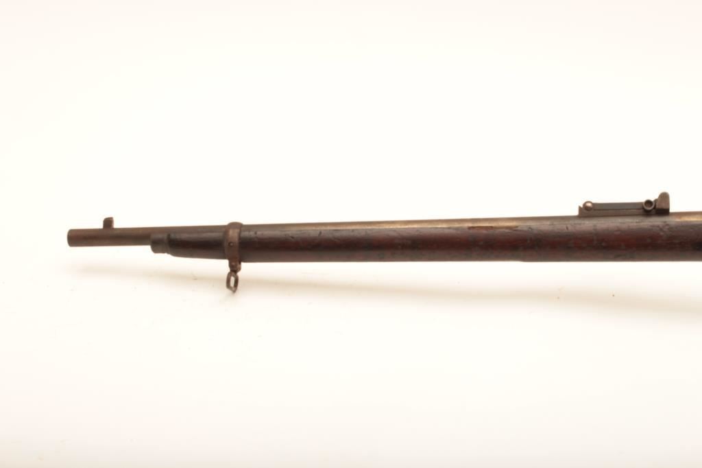 BSA Martini Cadet falling block single shot rifle, .310 Cadet/Greener caliber, Serial #30549. The rifle is in fair overall condition with a 25” barrel. The barrel has gone primarily to a dark grey patina with a post front and military tangent style rear sights. The receiver retains a significant amount of its original blue finish and is marked, BSA on one side and “COMMONWEALTH OF AUSTRALIA” on the reverse. The smooth wood stocks are in fair condition with numerous cartouches on the butt, mars, dents and compressions from carry and use. The bore is fair, the action functions and the markings are legible. Est.: $150-$300. (Antique).