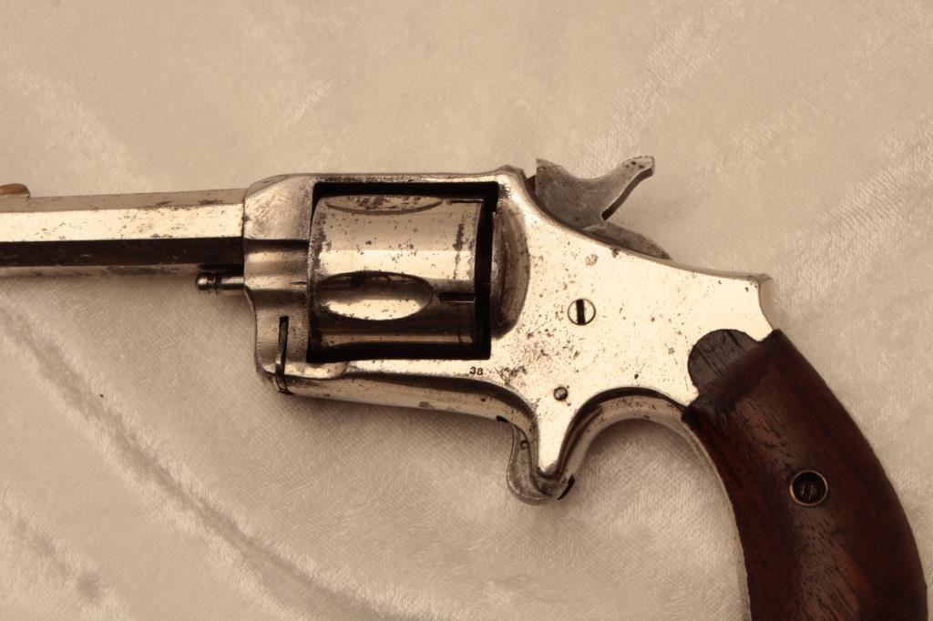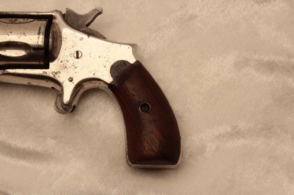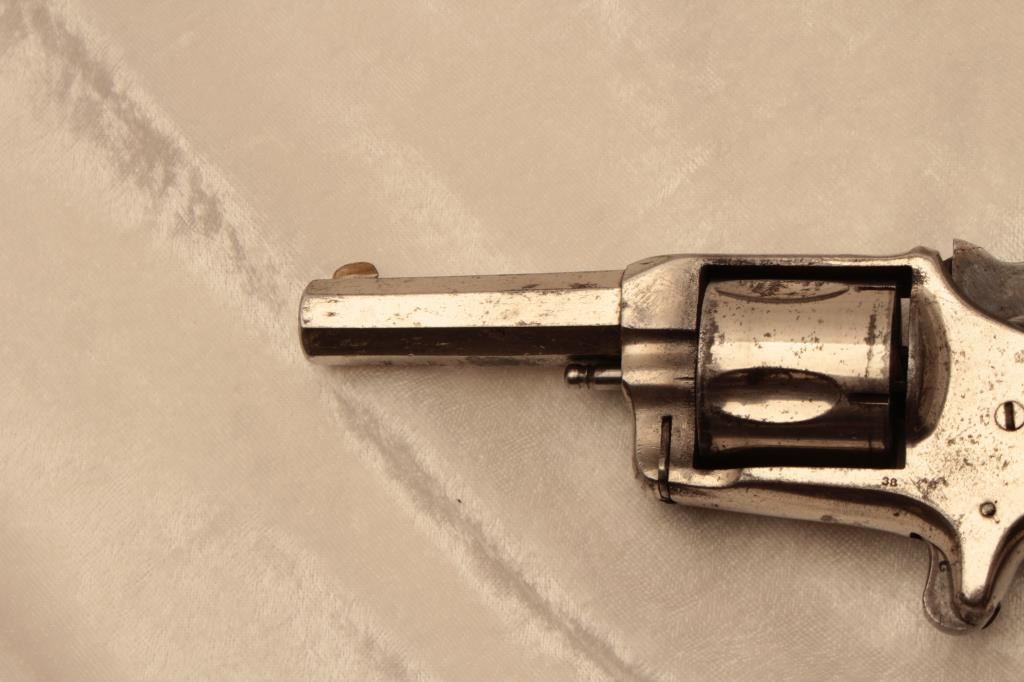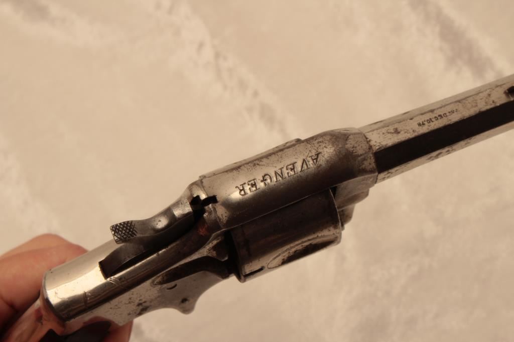 Spur trigger revolver marked “Avenger” on top strap, .38RF caliber, 2.75” octagon barrel, nickel finish, wood grips, no visible S/N; overall good condition with majority of nickel finish remaining, dark bore, good markings, replaced cylinder pin, action working and good grips. (Antique). Est.: $100-$200.