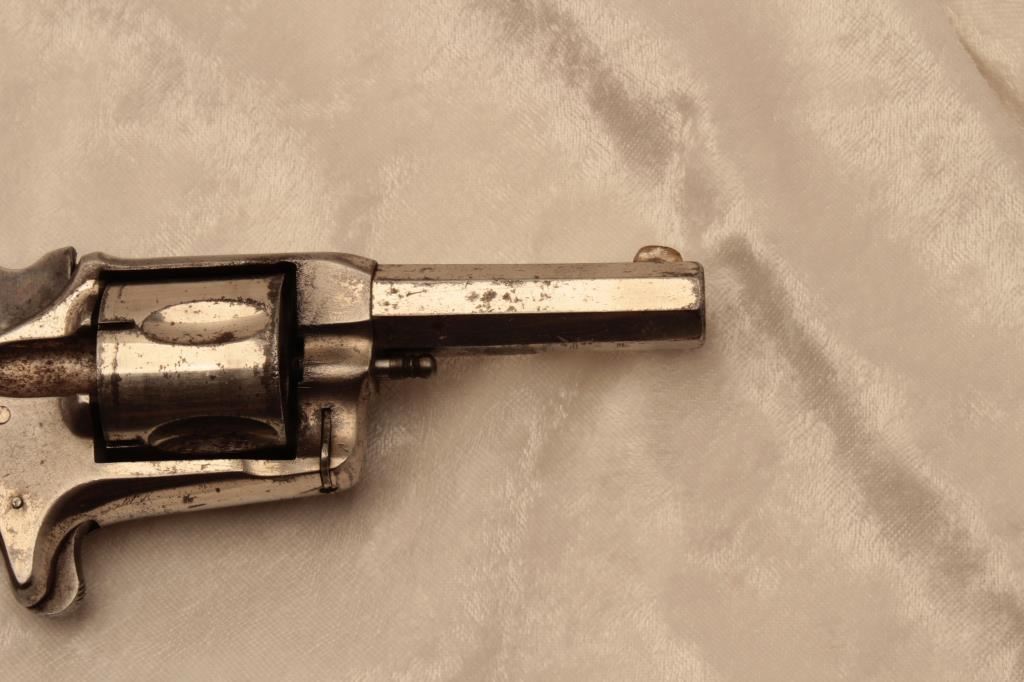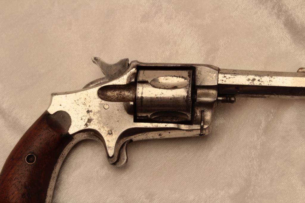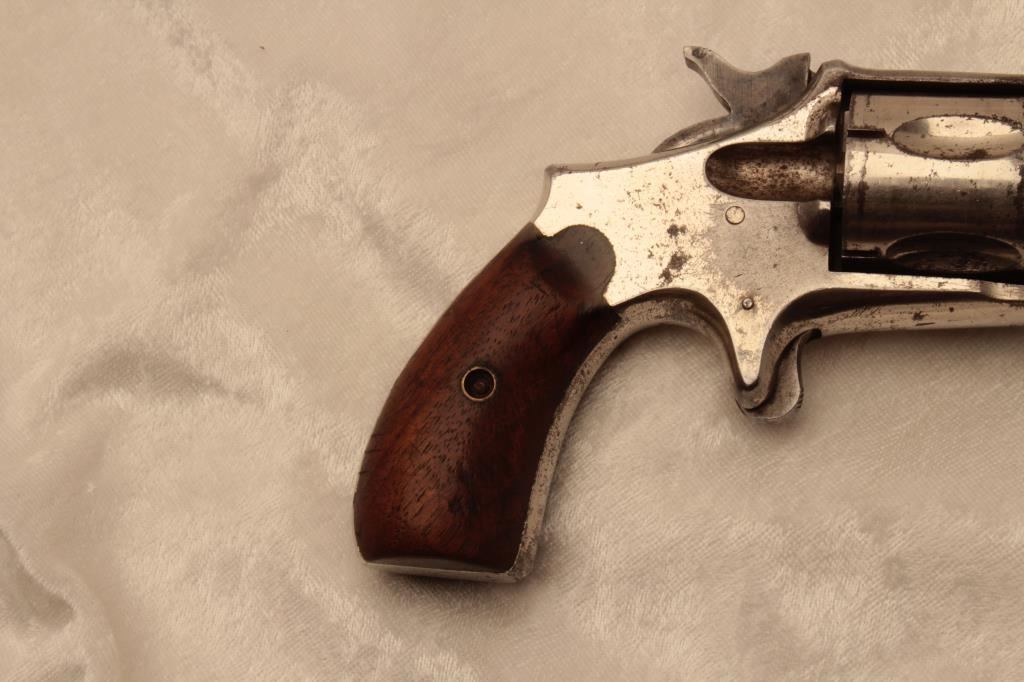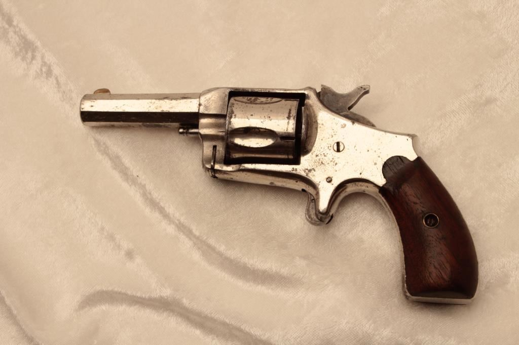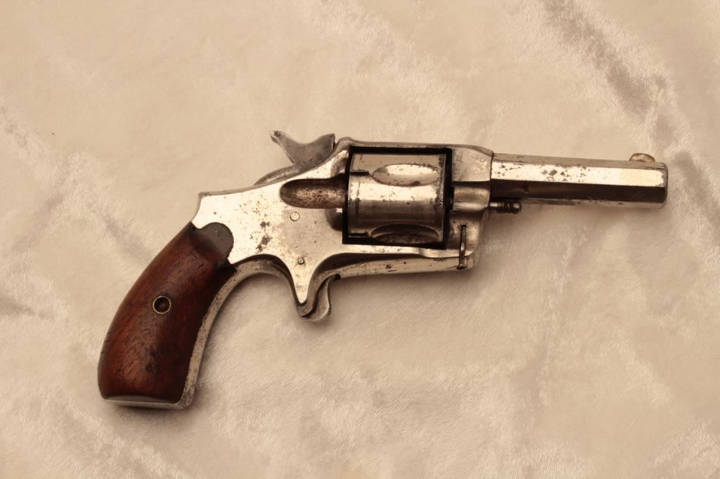 Spur trigger revolver marked “Avenger” on top strap, .38RF caliber, 2.75” octagon barrel, nickel finish, wood grips, no visible S/N; overall good condition with majority of nickel finish remaining, dark bore, good markings, replaced cylinder pin, action working and good grips. (Antique). Est.: $100-$200.