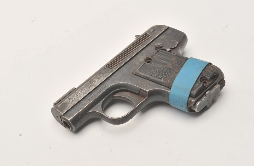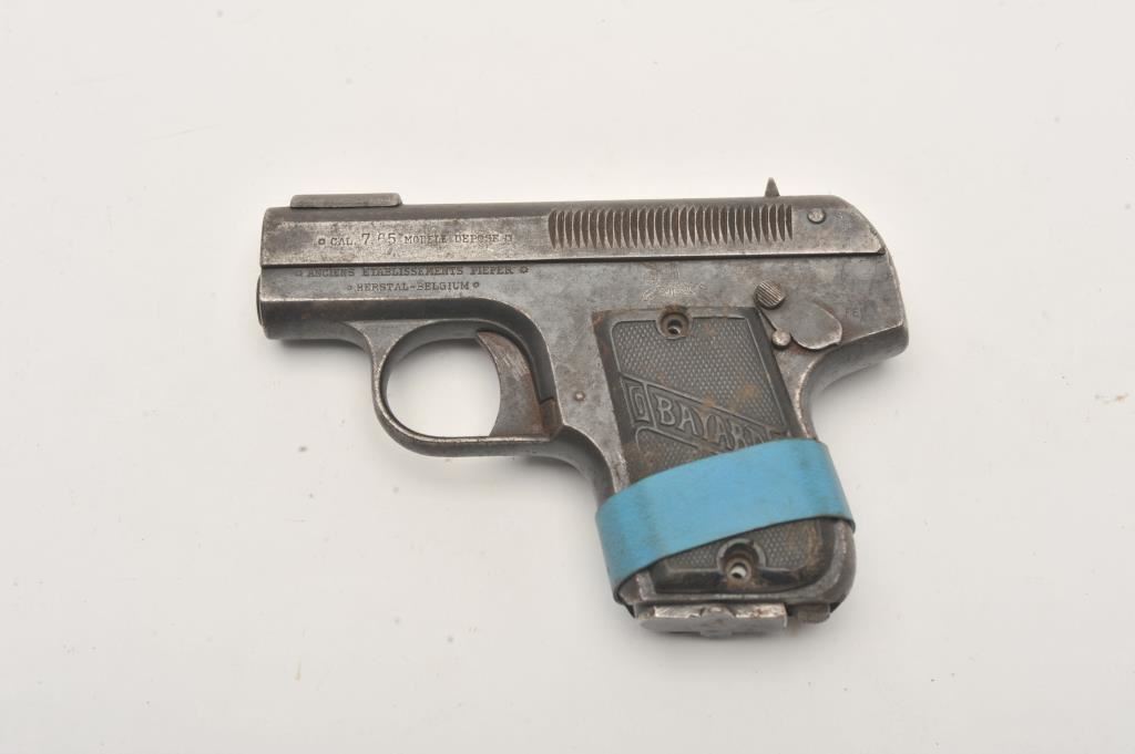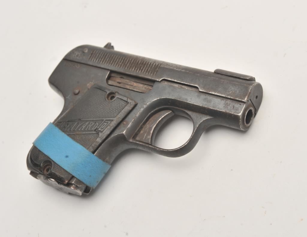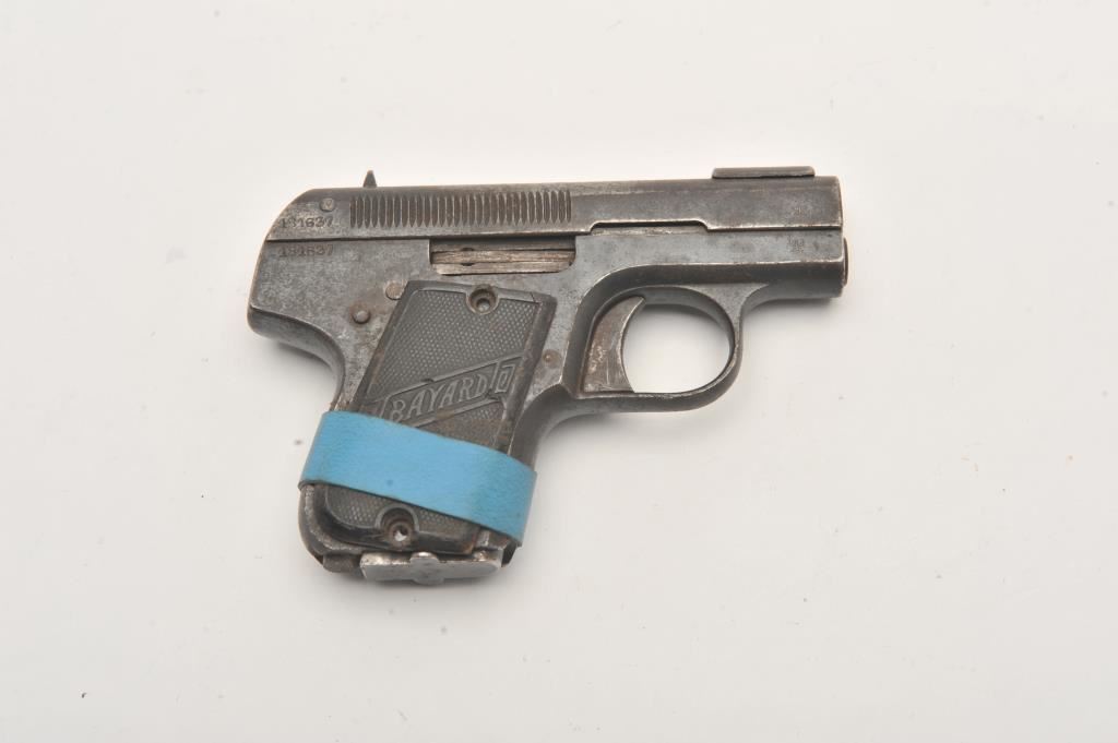 Bayard Modele Depose semi-automatic pistol, 7.65mm caliber, Serial #181637. The pistol is in fair overall condition with a 2 ½” barrel. The metal surfaces are a dark grey patina with light surface erosion noted. The checkered plastic grips are secured with a rubber band and show heavy wear. The bore is poor, the action functions and the markings are legible. The lot includes one correct magazine. Est.: $25-$50. (C+R).