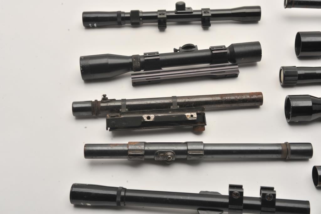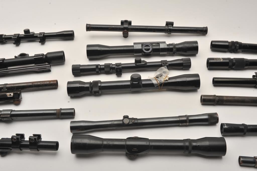 Bonanza lot of vintage rifle scopes, mounts and rings. The lot includes over 15 scopes by Bushnell, JC Higgins, Marlin and other manufacturers, some are incomplete or missing parts. Est.: $50-$100.