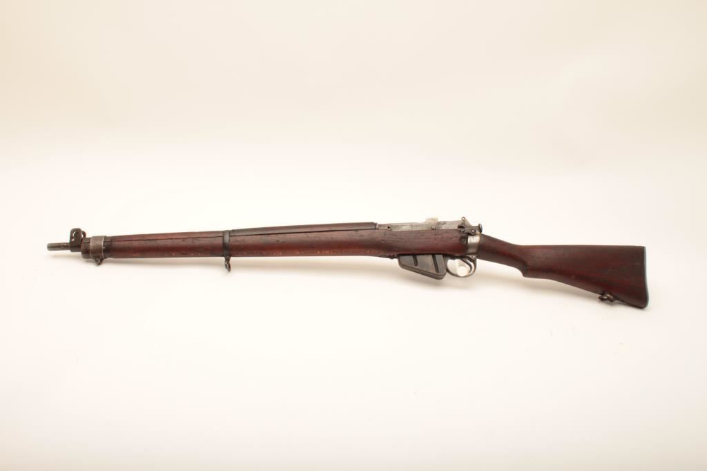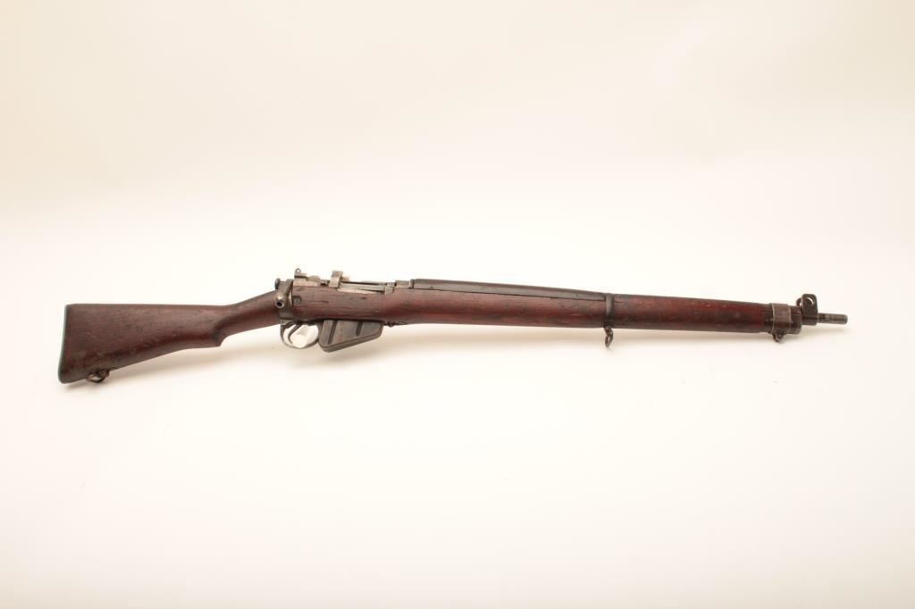 Lee-Enfield No.4 MKI bolt action rifle, .303 British caliber, Serial #B0656. The rifle is in good overall condition with a 25” barrel. The metal surfaces retain the majority of their military finish with the rear aperture sight removed and dated 1942. The smooth wood stock is in fair condition showing heavy use with dents, mars and bruising. The buttstock retains the sling swivels and ends with an aluminum butt plate with trap. The bore is fair, the action crisp and markings are legible. Est.: $100-$200. (C+R).