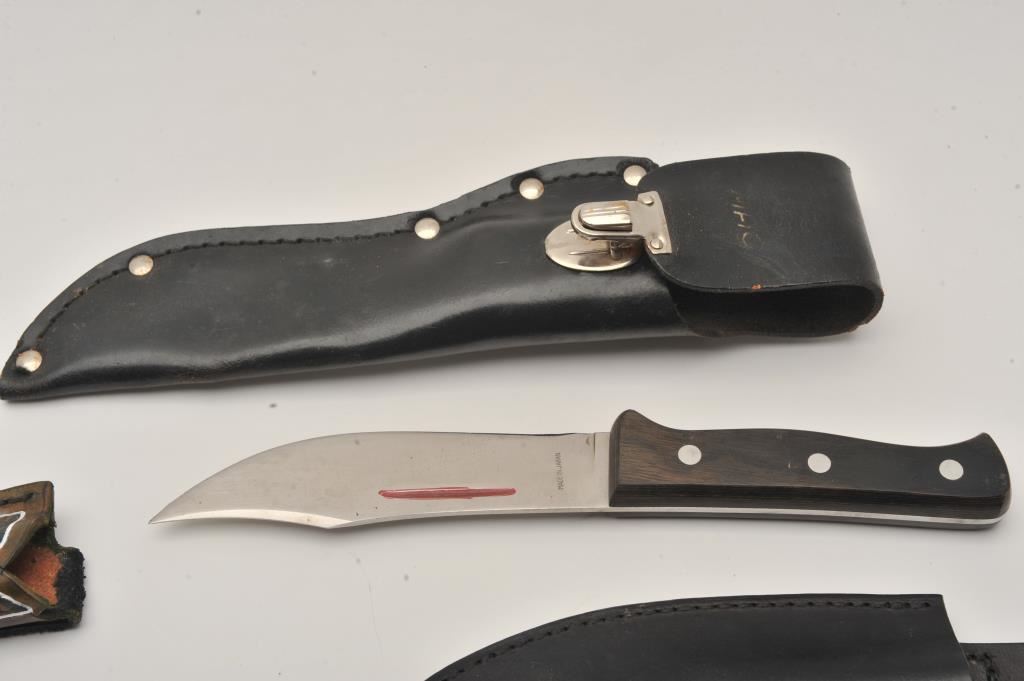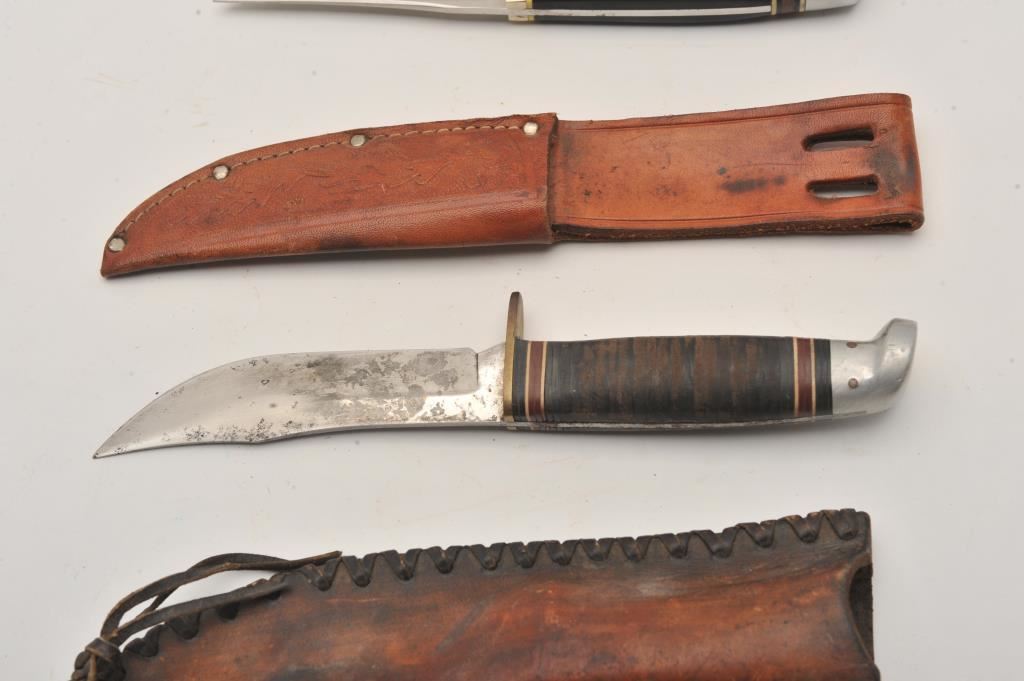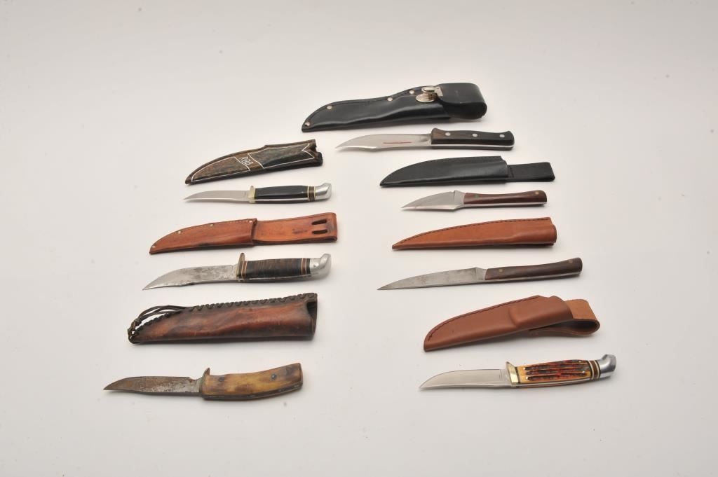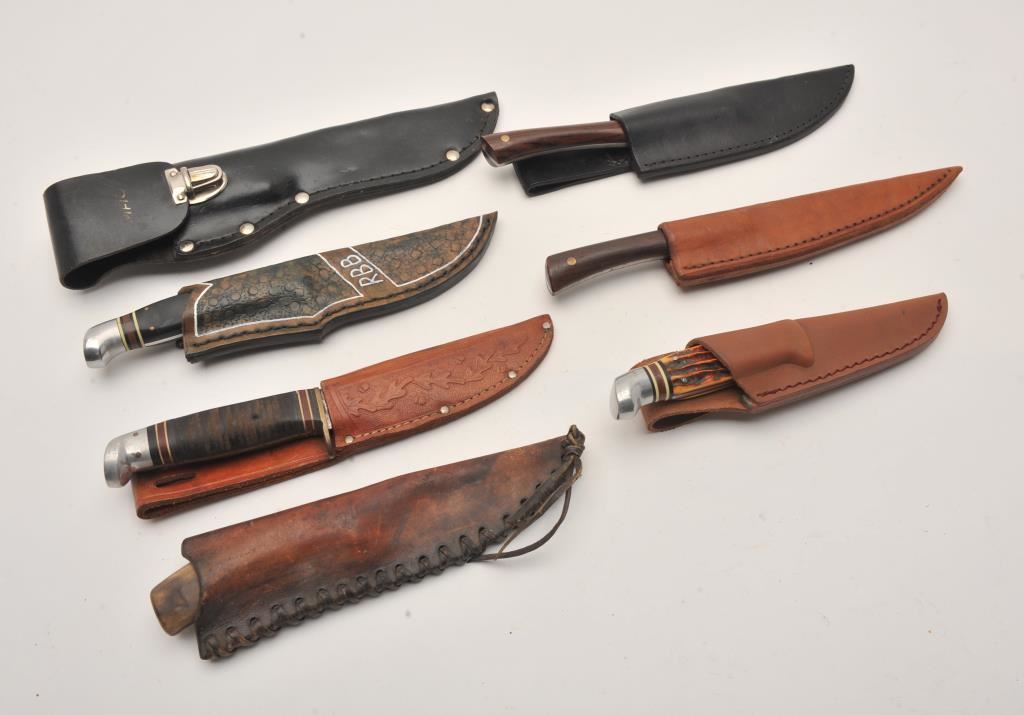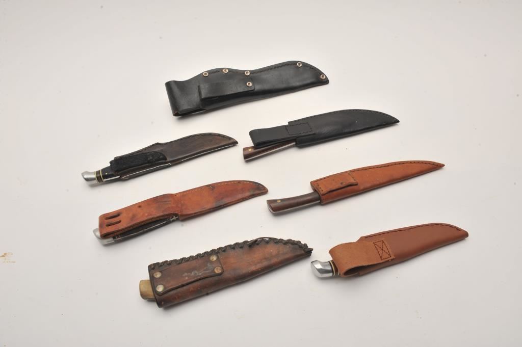 Lot of nine assorted fixed blade knives, all with leather scabbards. Two are in rough condition with moderate surface rust; the remainder are in good condition. Est.: $75-$150.