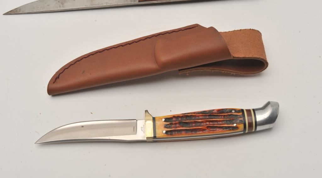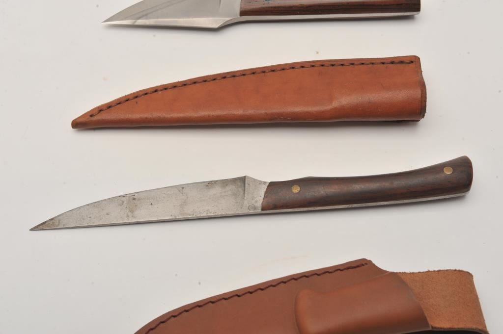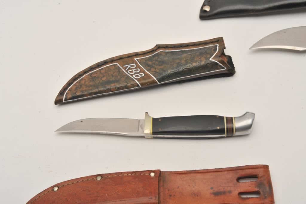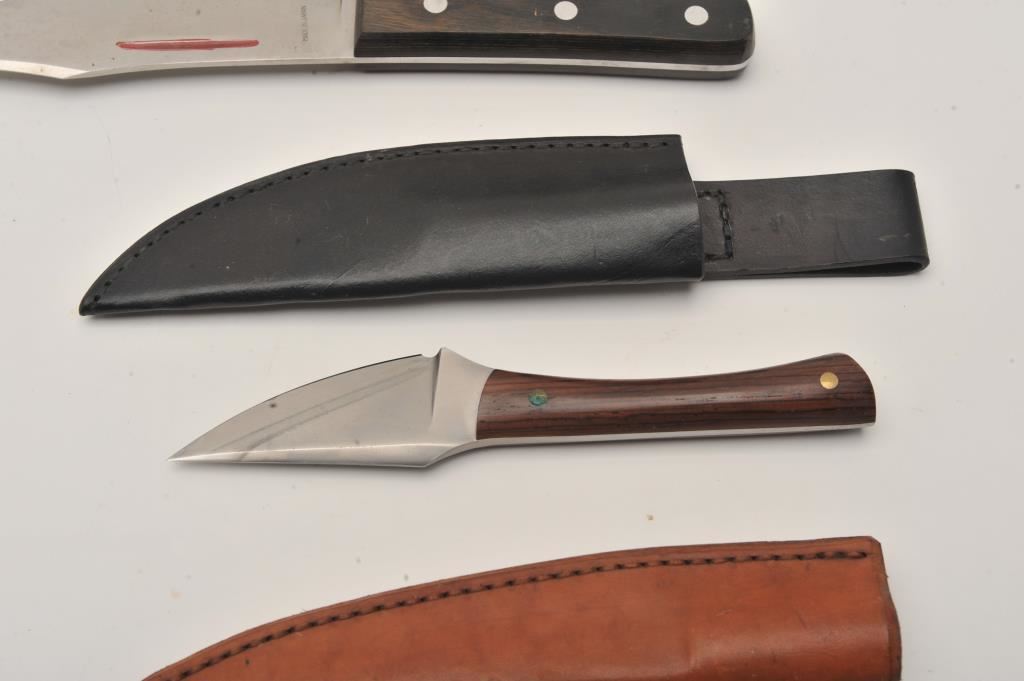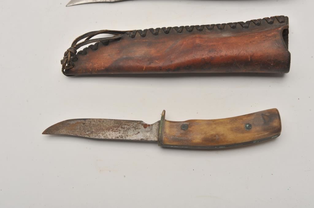 Lot of nine assorted fixed blade knives, all with leather scabbards. Two are in rough condition with moderate surface rust; the remainder are in good condition. Est.: $75-$150.