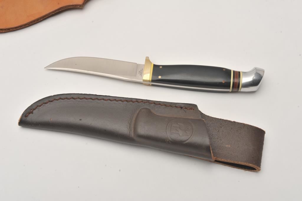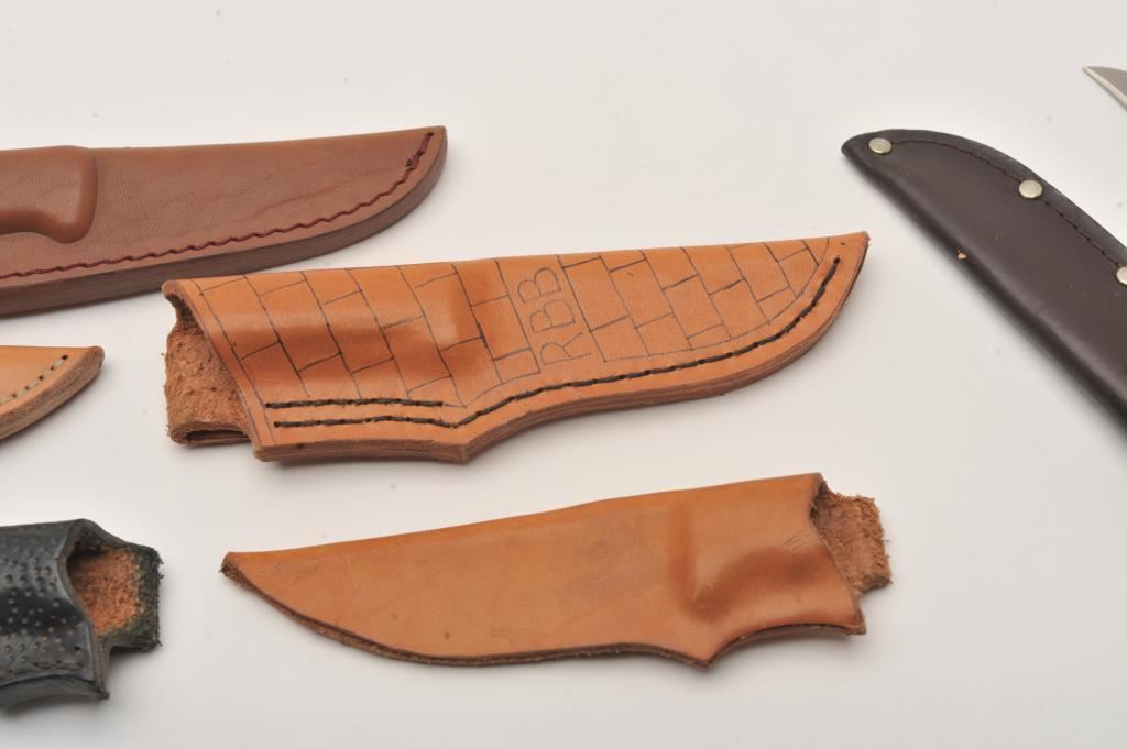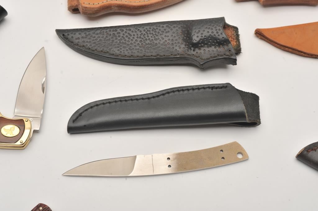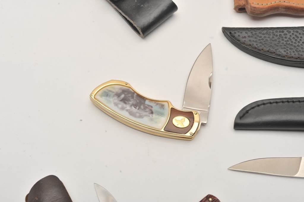 Lot of seven fixed blade and folding knives. The lot includes; a Franklin Mint folder with scales depicting Labrador Retrievers, a Cattaraugus CM-10 folder, stainless steel throwing knife, fixed blade hunters by Kissing Crane, Timber Wolf and Linder and a Puma fixed blade hunter with a faux Damascus steel blade and leather scabbard. The lot includes an additional five leather scabbards. A bonanza lot of knives and scabbards all in very good condition. Est.: $125-$250.